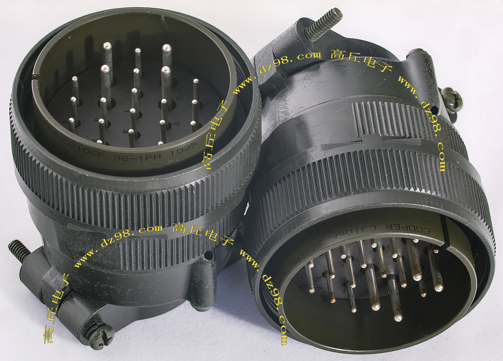 | COOPER C3106F36-1PN 22P航空插头公插头连接器BQD549 | 全新进口备件,做工精致,军品级插头,共22P(4大P+18小P),4大P镀银导电芯顶端直径约2.35毫米,每芯承受电流估计25-35A,18小P镀银导电芯顶端直径约1.58毫米,每芯承受电流估计5-8A(max10A),可拆镀银电芯用,与商品编号BQD550母插头的镀银导电芯 对插配合使用,铝合金外壳,重量243克。 |