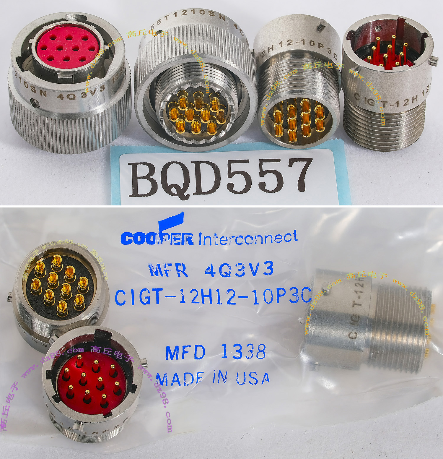 | COOPER CIGT-12H12-10P3C CIGT-56T1210SN 4Q3V3 10P镀金 航空插头插座 精密连接器BQD557 | 全新进口备件,做工精致,军品级插头与插座,共10P,每芯承受电流估计5A,金属外壳,镀纯金导电芯,重量57克,用于精密电子设备连接。 |