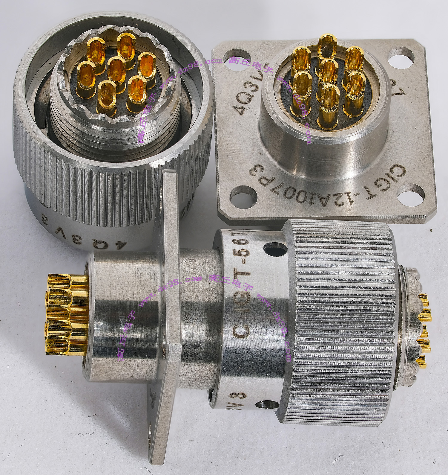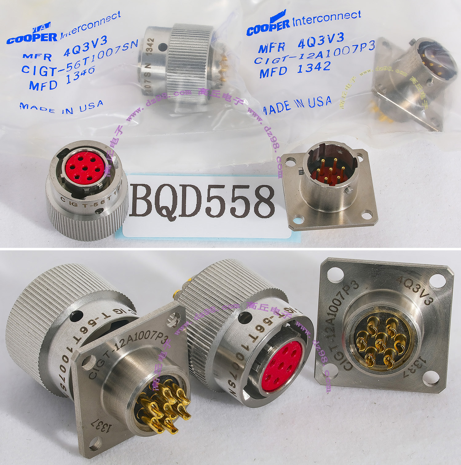 | COOPER CIGT-12A1007P3 CIGT-56T1001SN 4Q3V3 7P镀金 航空插头插座 精密连接器BQD558 | 全新进口备件,做工精致,军品级插头与插座,共7P,每芯承受电流估计5A,金属外壳,镀纯金导电芯,重量42克,用于精密电子设备连接,安装开孔直径14mm,安装螺丝孔距离18mm。 |