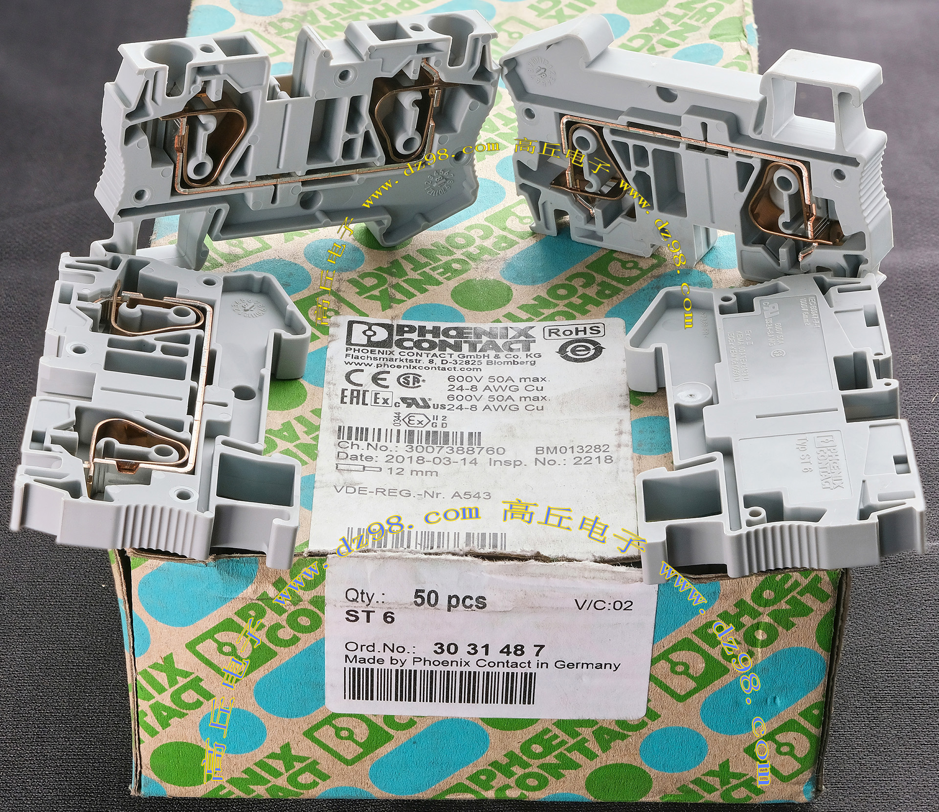 PHOENIX CONTACT菲尼克斯ST6 600V 50A 24-8AWG导轨卡装接线端子BQD584 数量50片 |