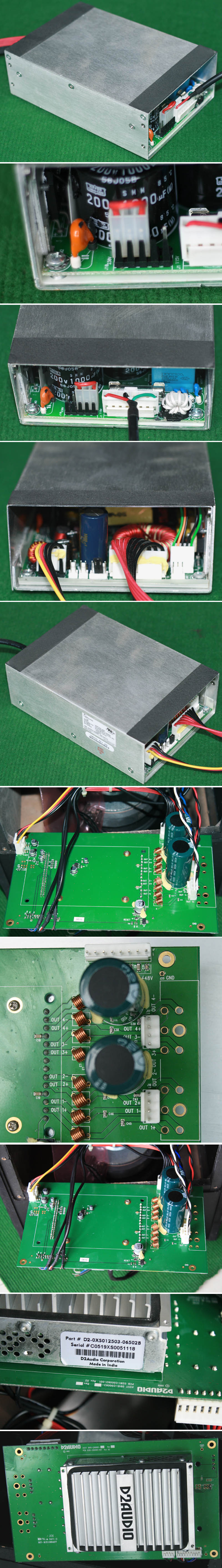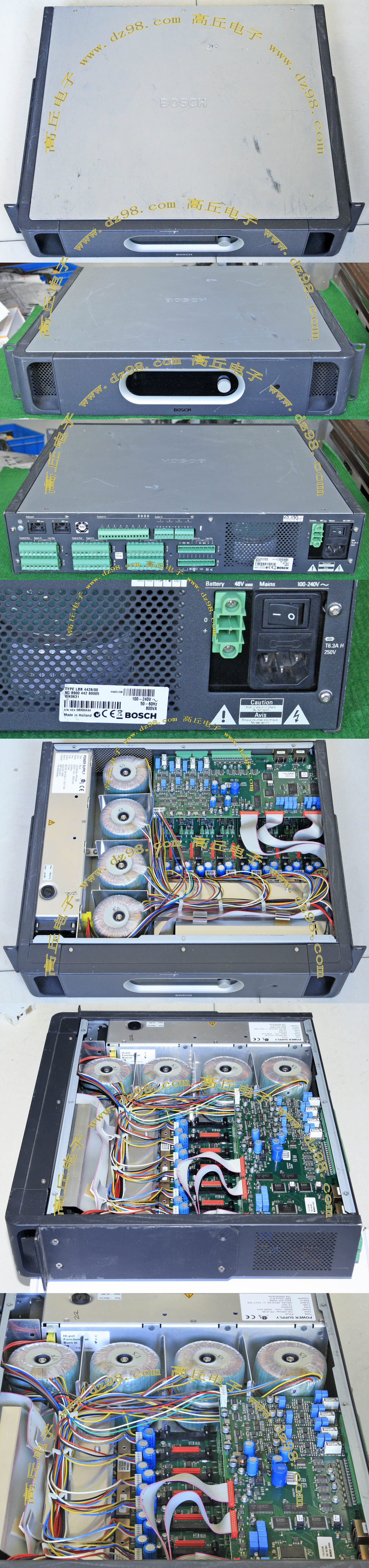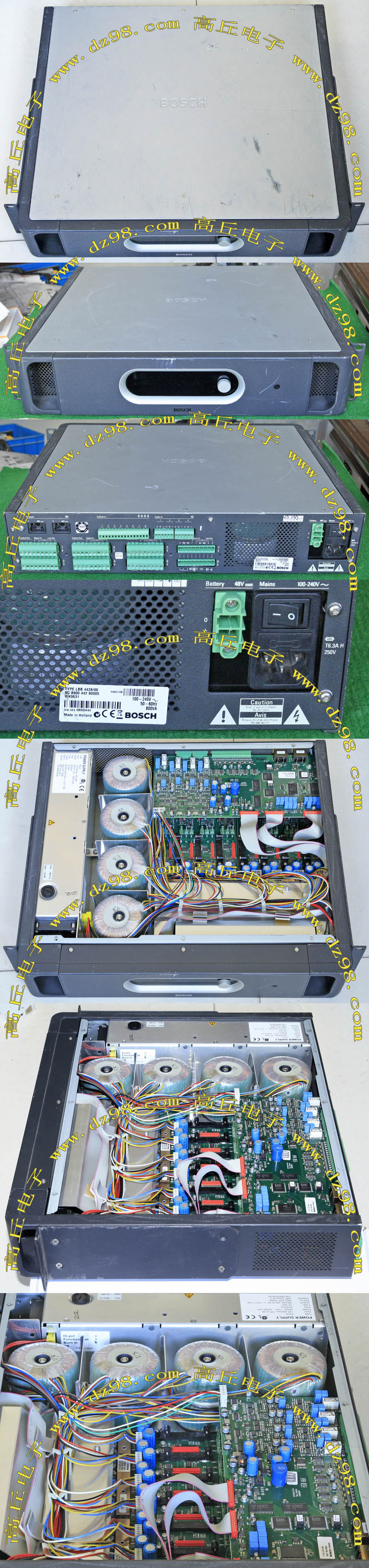 拆机件 | 本商品从进口原装大型设备机架上拆下,没有喇叭网罩的(本来就没有做在音箱上),内部装有D2AUDIO全数字3声道功放一只,搭配DC50V输出350W高频高速变换开关电源一只,8寸大磁钢低音喇叭一只。其电源输入电压是115V和230V两用,箱内电源莫认输入电压为115V(因为国外的电压115V),所以要打开后板把电源输入插头选择插到230V,内部的3通道功放有两个通道输出到接线柱,一个通道输出接到内部低音炮喇叭。输入不是普通的音频信号,具体怎么用我们也不知道,所以购买本低音炮要懂得数字功放的才可以买,如果你不懂数字功放,可以单独购买低音炮箱连喇叭(就是已经拆掉电源和功放的)。当然对数字功放感兴趣的也可以单独购买研究。 根据你需要买什么就拆什么。 |