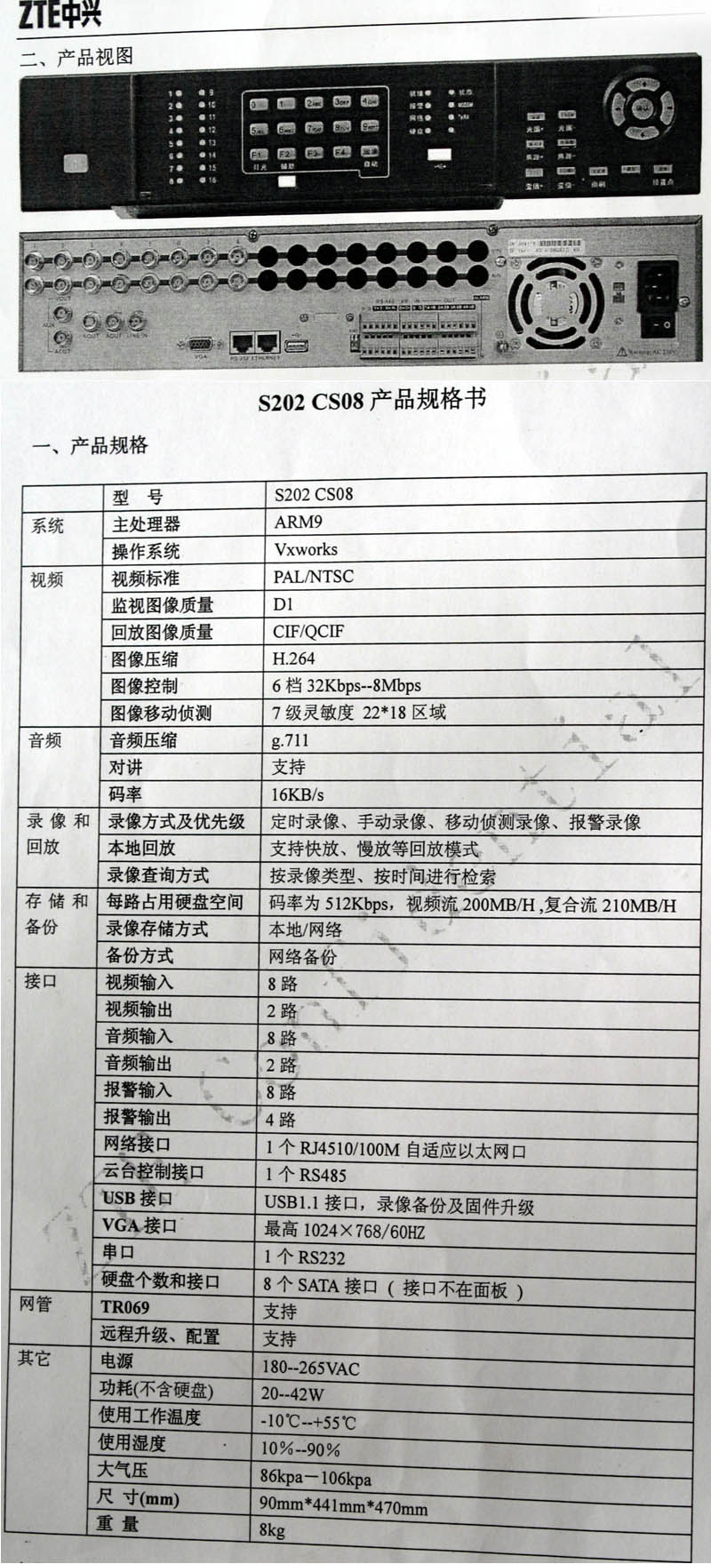 全新 | 全新品,国内著名视频监控专业厂家:海康威视,,海康为中兴代工生产,对应海康型号是:DS-8008HC,机器全部未使用过,没有包装,附带遥控器操作,机内硬盘接口SATA,外部功能接口:USB、RS-485、网络口、VGA显示器接口(支持1024x768分辨率),视频输出接口,英文操作图形菜单。 |