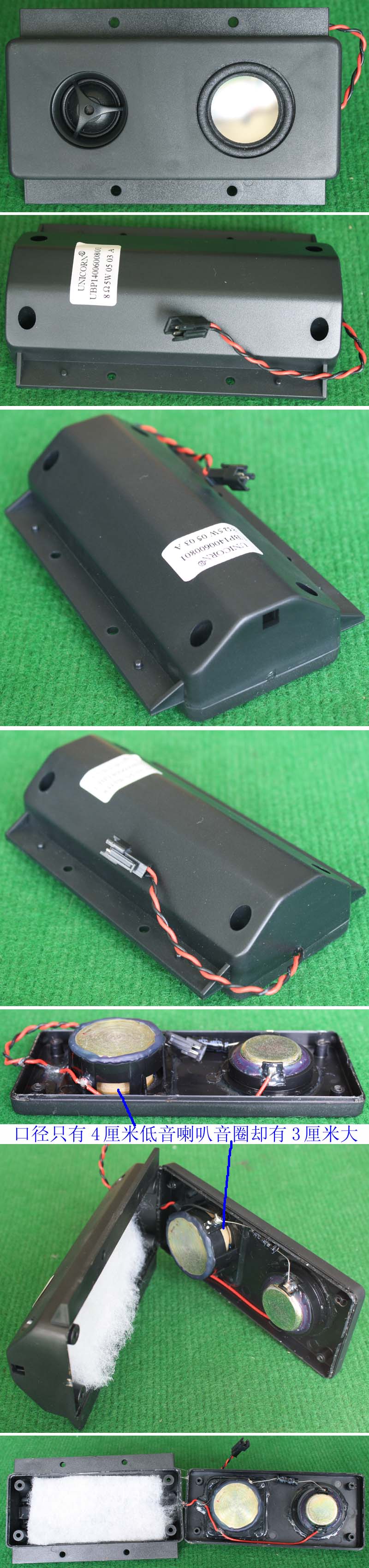 全新品,是装在某设备上使用的备件,外形尺寸:140x82x38毫米,重量约185克。高音喇叭口径30毫米,低音喇叭口径40毫米、音圈却大到30毫米,内部装有吸音材料和分频电容,详细看图片。 |