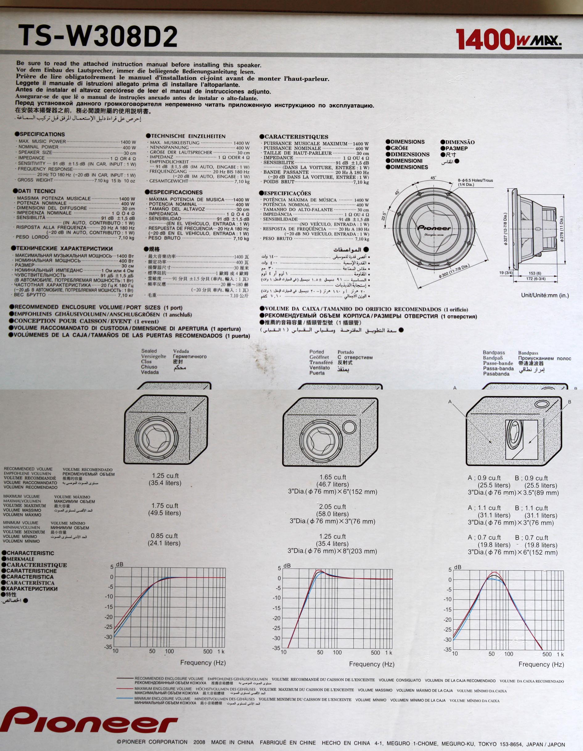 | PIONEER TS-W308D2 4欧姆 400W大功率双音圈低音喇叭BQE81 无货 |