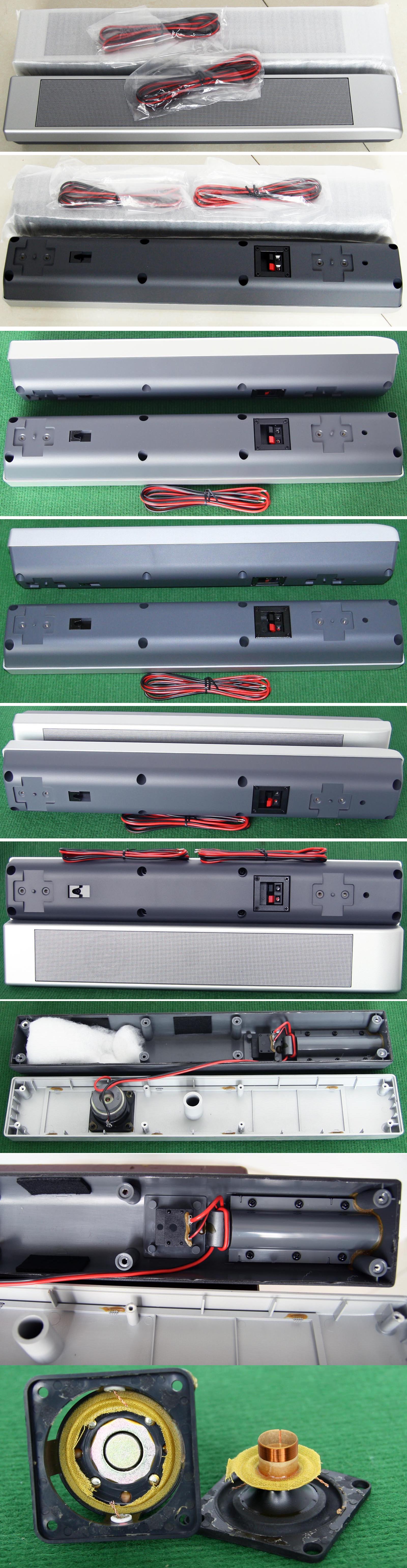 全新 | 全新商品,产地:TAIWAN,做工精美,厚实坚固的外壳,手感不错,金属细孔面网,原包装每箱12只。液晶电视、等离子电视、外挂音箱,内部装1只6欧姆 全频带双磁钢长冲程喇叭, 喇叭口径2寸,音圈直径14毫米,多种安装方式:《一》后背有挂钩可挂墙(只要在墙面拧一只螺丝即可)、《二》后背共有4个4毫米公制螺纹孔可以固定安装天花板及墙面、《三》底部一个直径25毫米圆孔,这不是到相孔(到相孔位于音箱中间位置孔朝前方),是用来空间竖直使用音箱的,用户可以自己找25毫米塑料管或金属管自制地座。音箱外形尺寸:长度496毫米,宽度83毫米,厚度65毫米,音箱配带长度约1.3米 接线,每只配带连接线重量约950克。 |