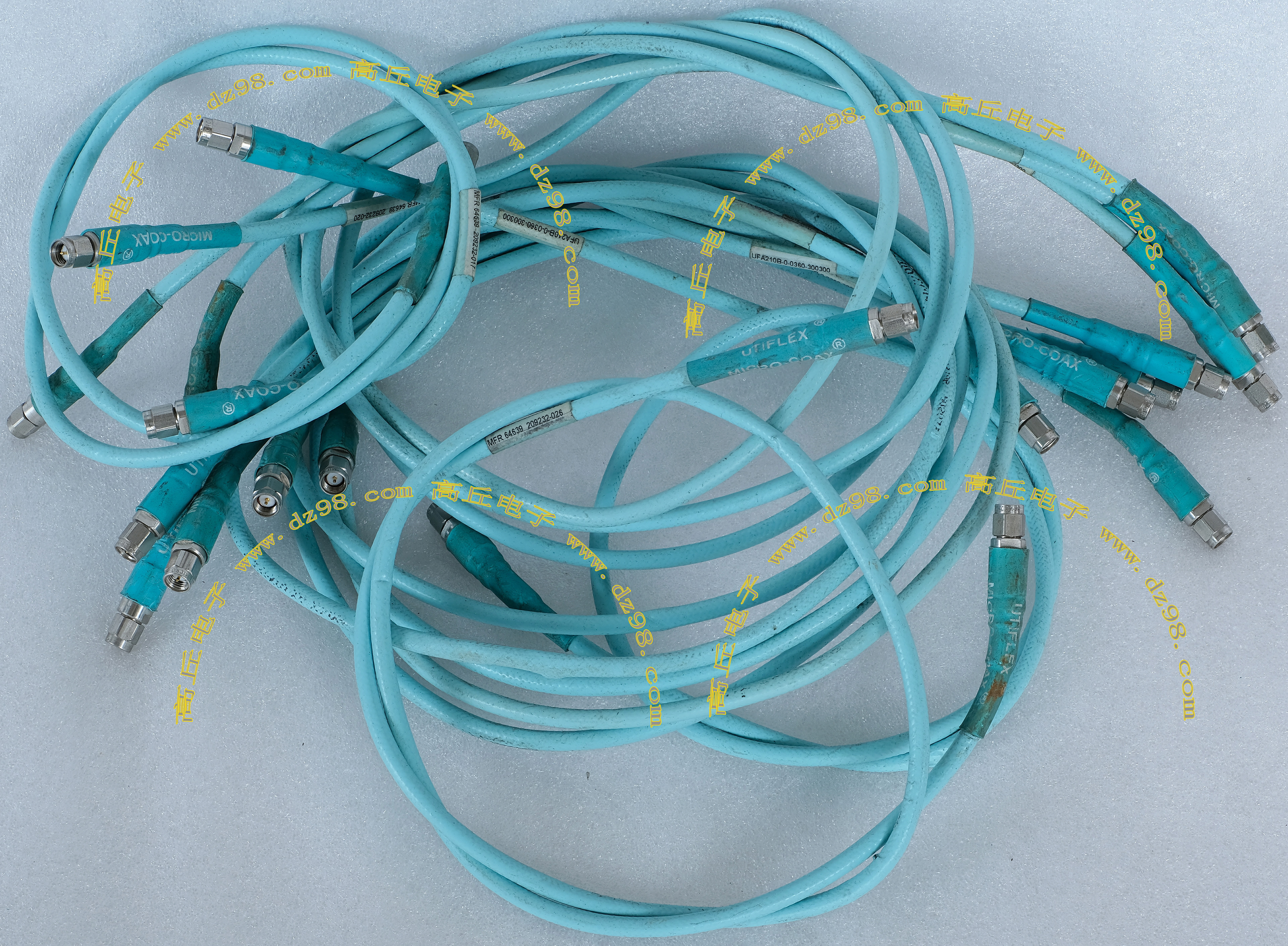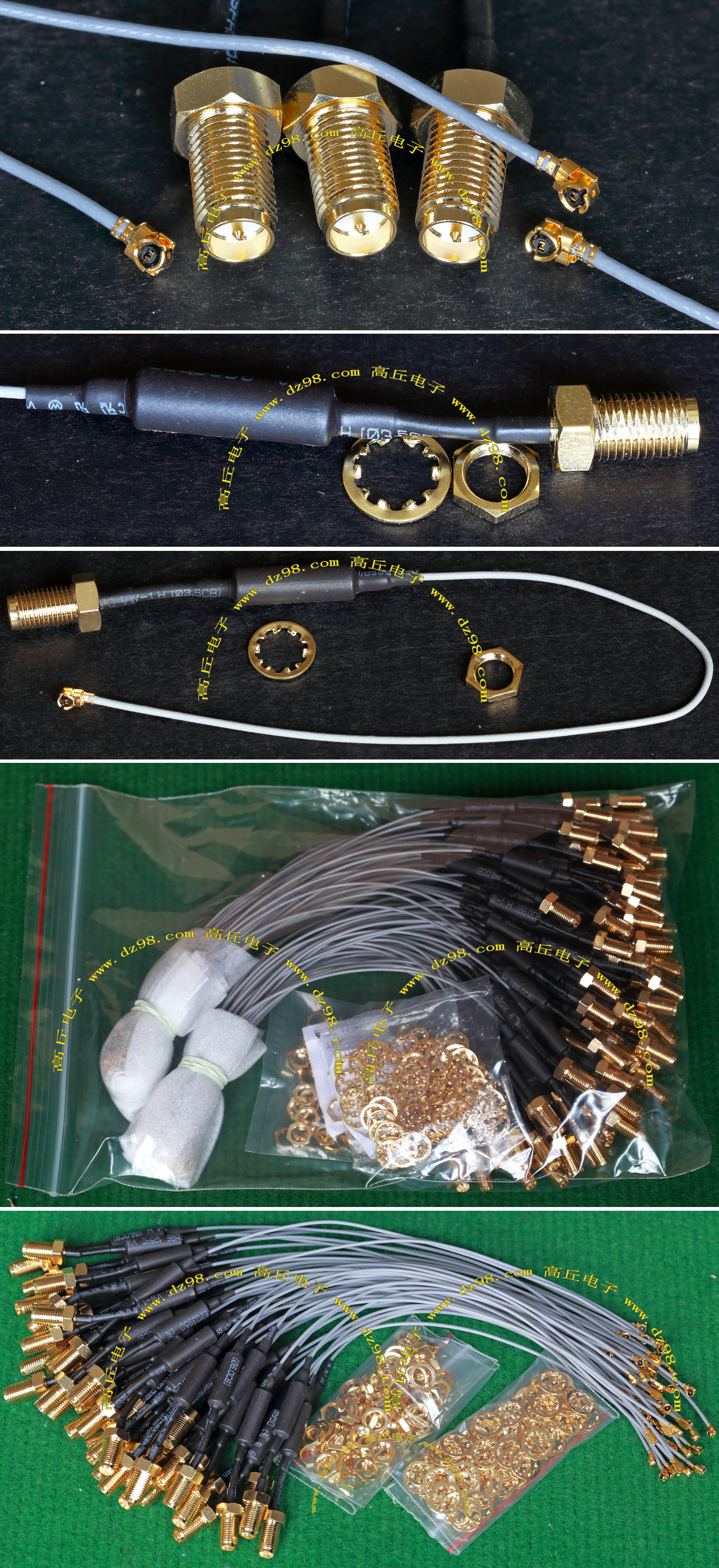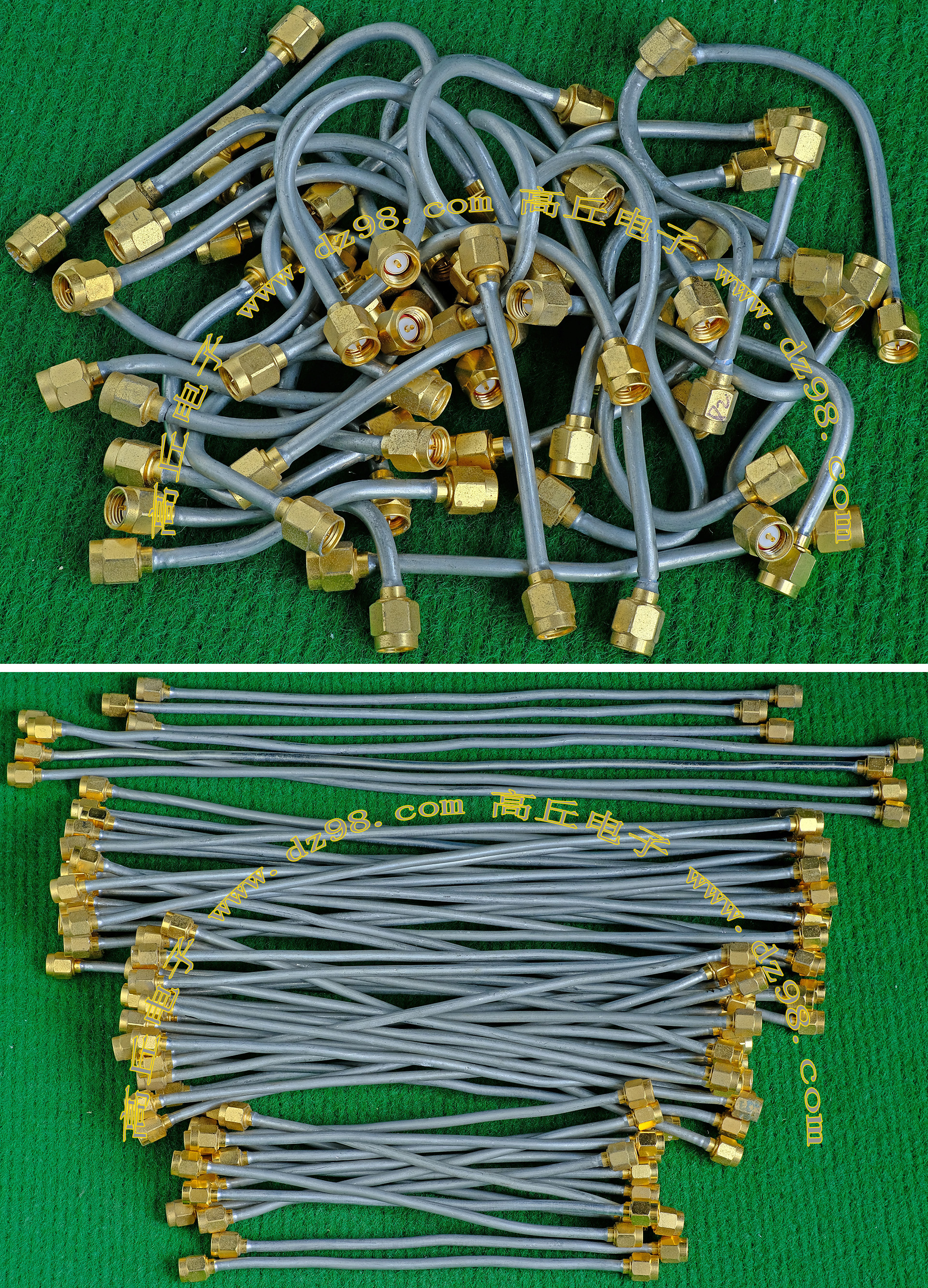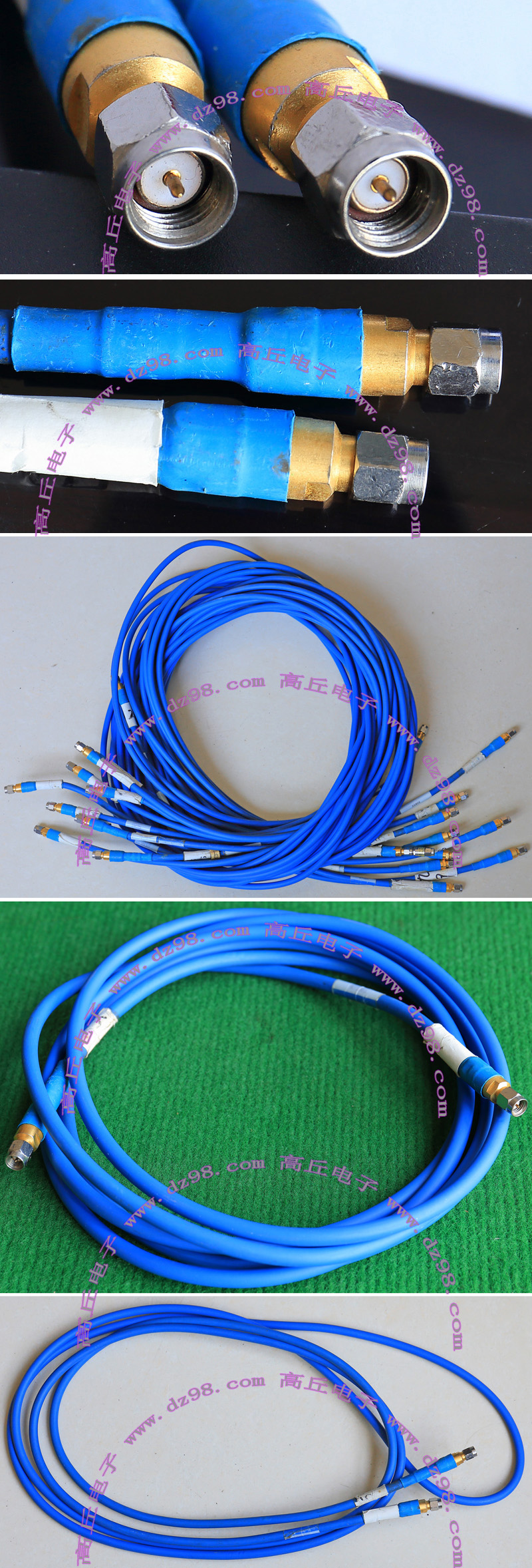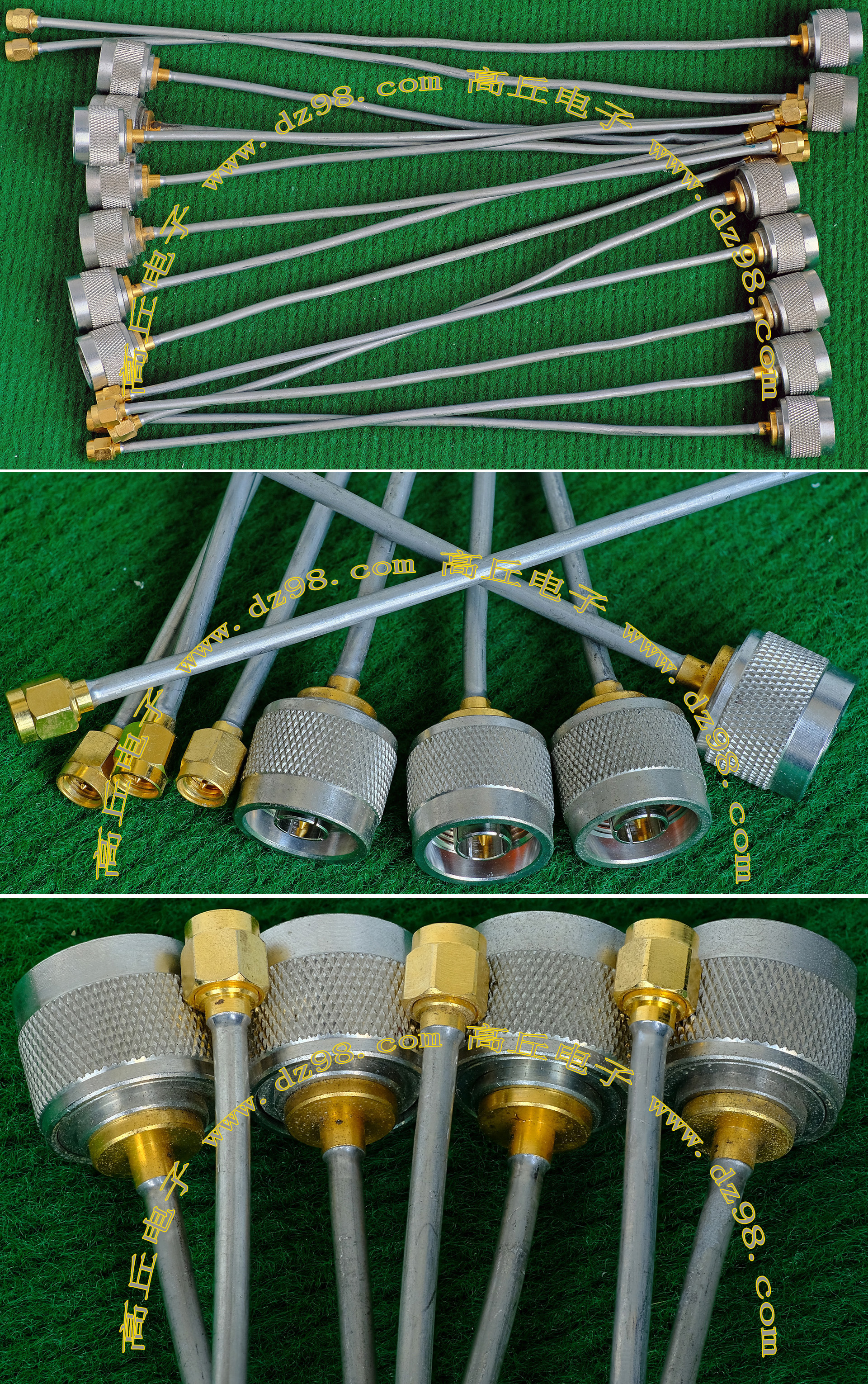 进口拆机,实物参照图片,线长度有10厘米到36厘米多种,一端带有镀黄金高频接头,多层屏蔽线直径约2.75毫米,内部结构看图片。