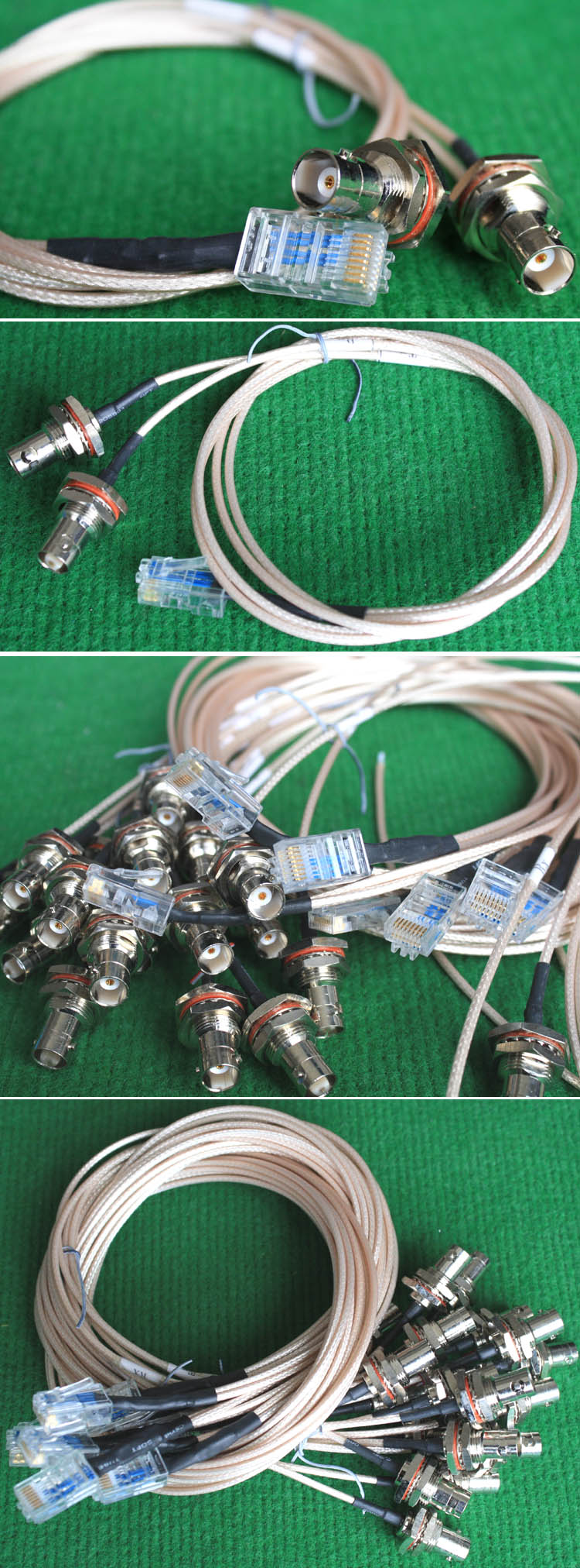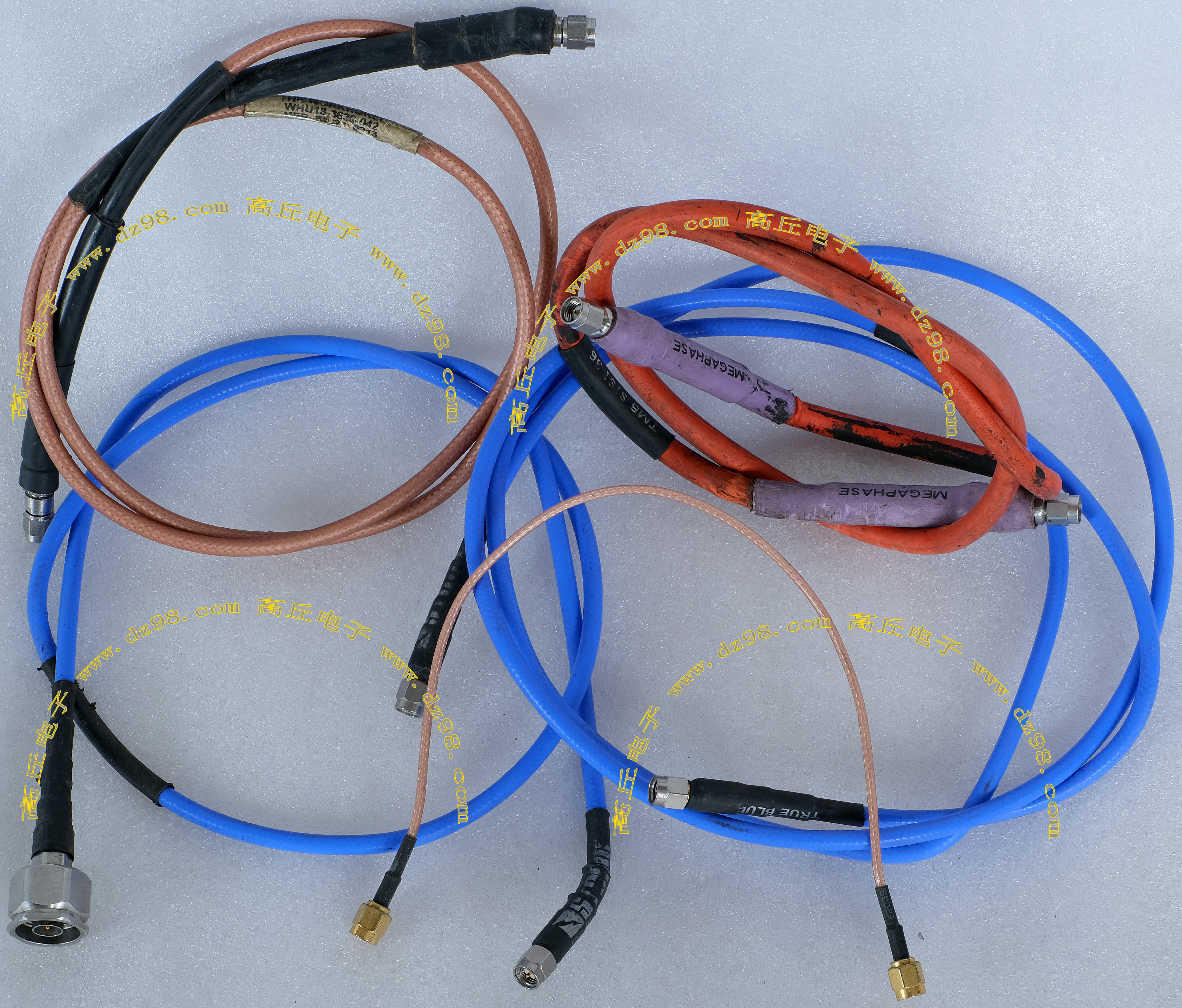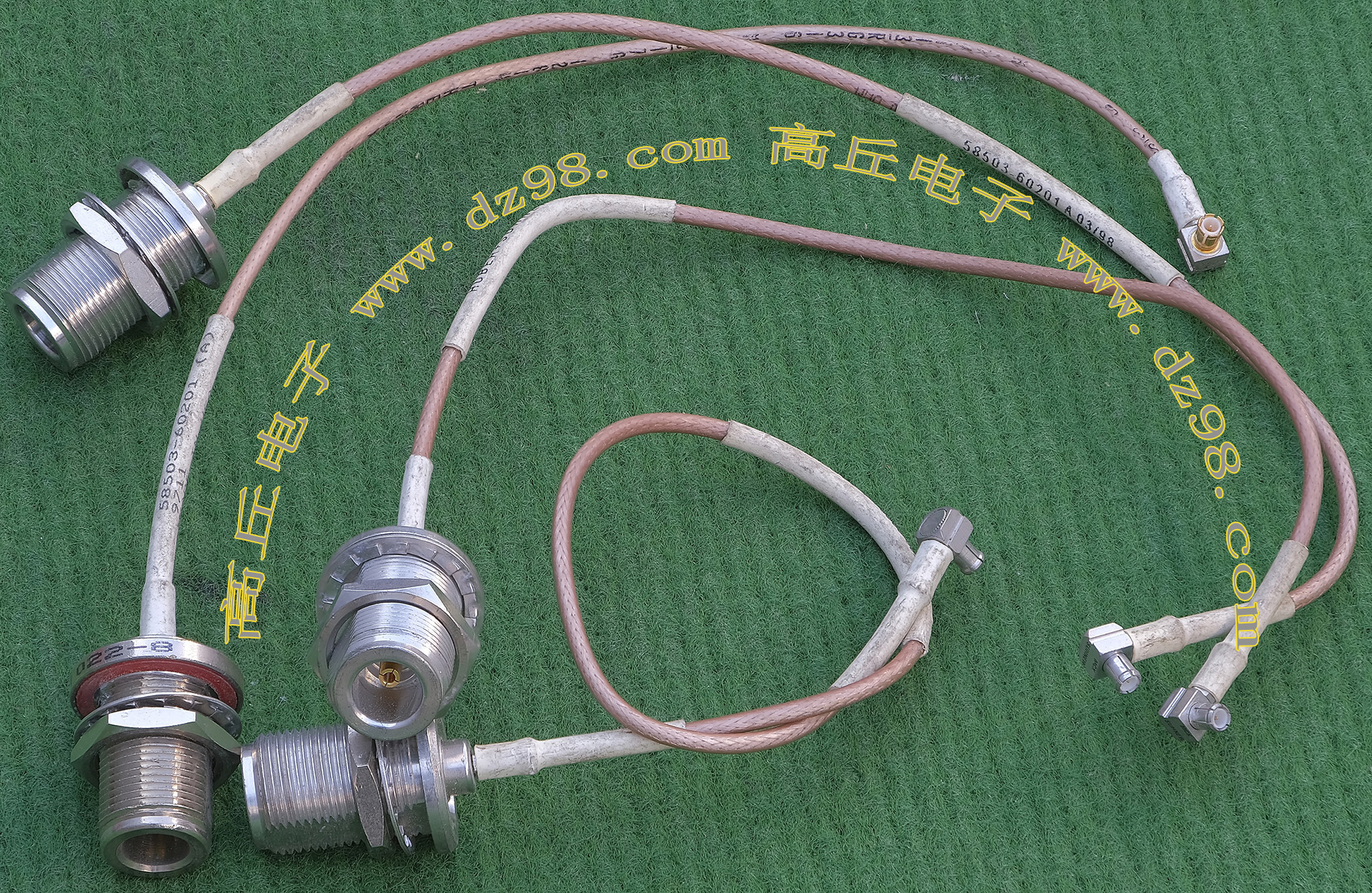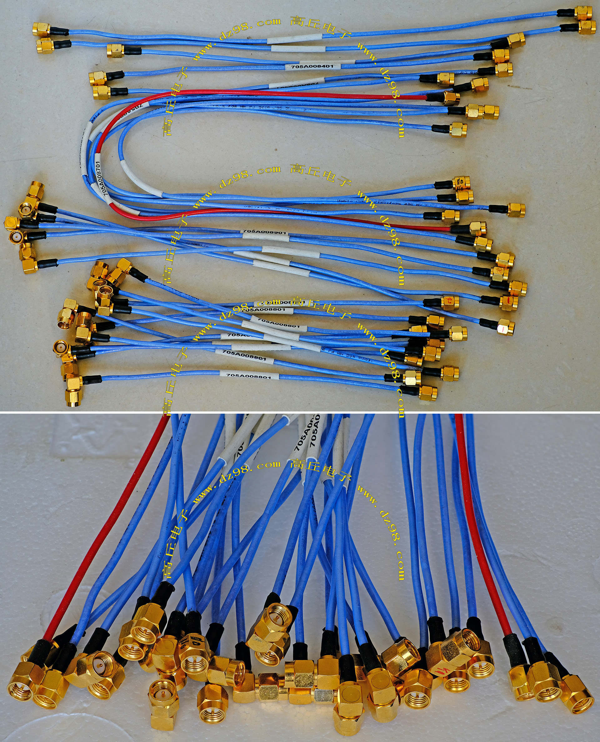 进口拆机,实物参照图片,线长度有10厘米到36厘米多种,一端带有镀黄金高频接头,多层屏蔽线直径约2.75毫米,内部结构看图片。