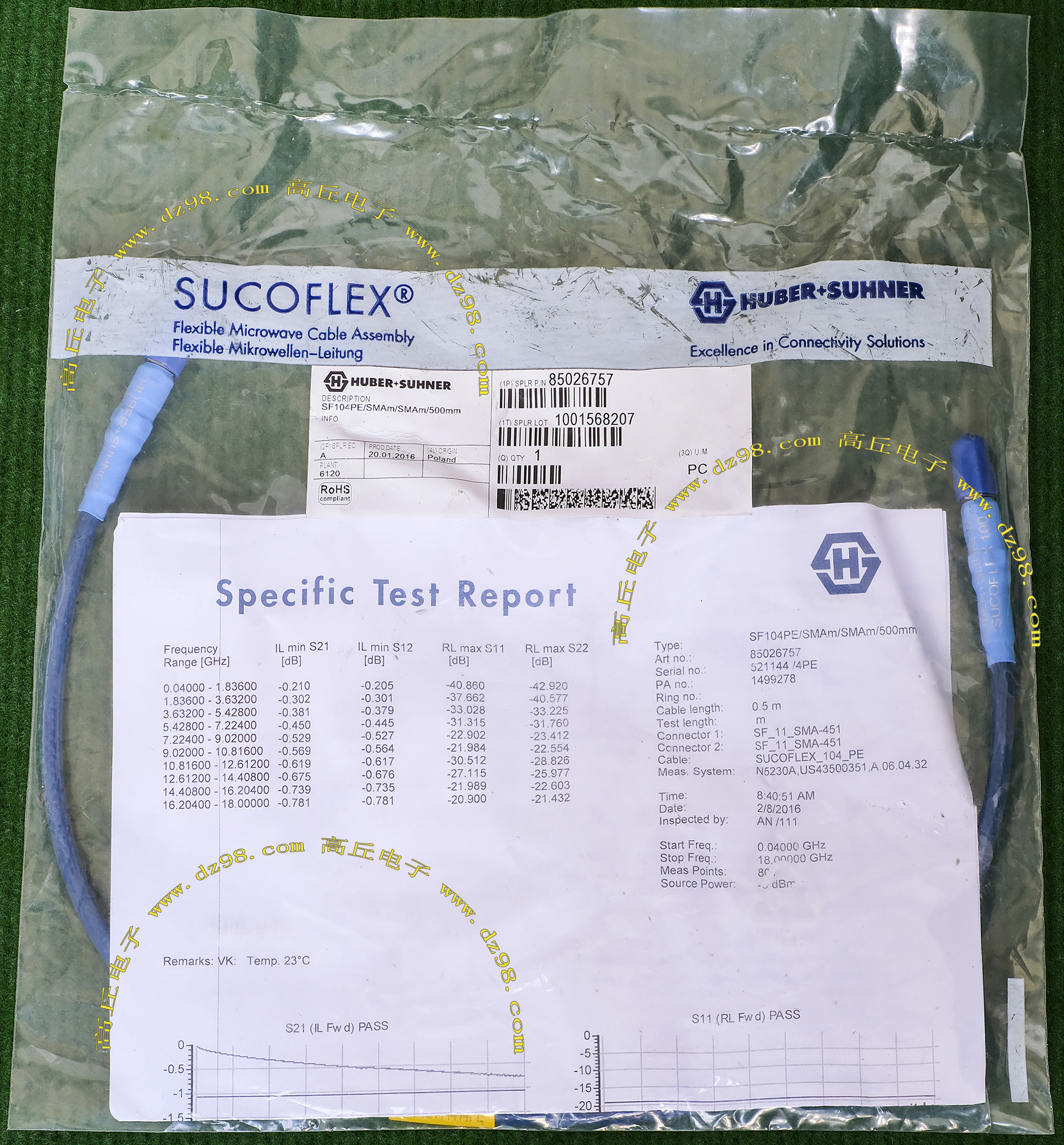 全新HUBER+SUHNER SF104PE/SMAm/SMAm/500mm高频射频信号线BRB362