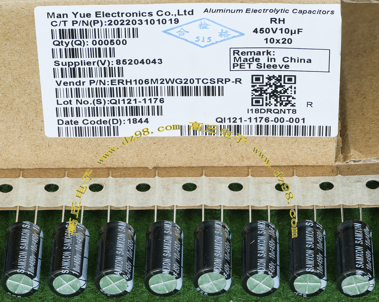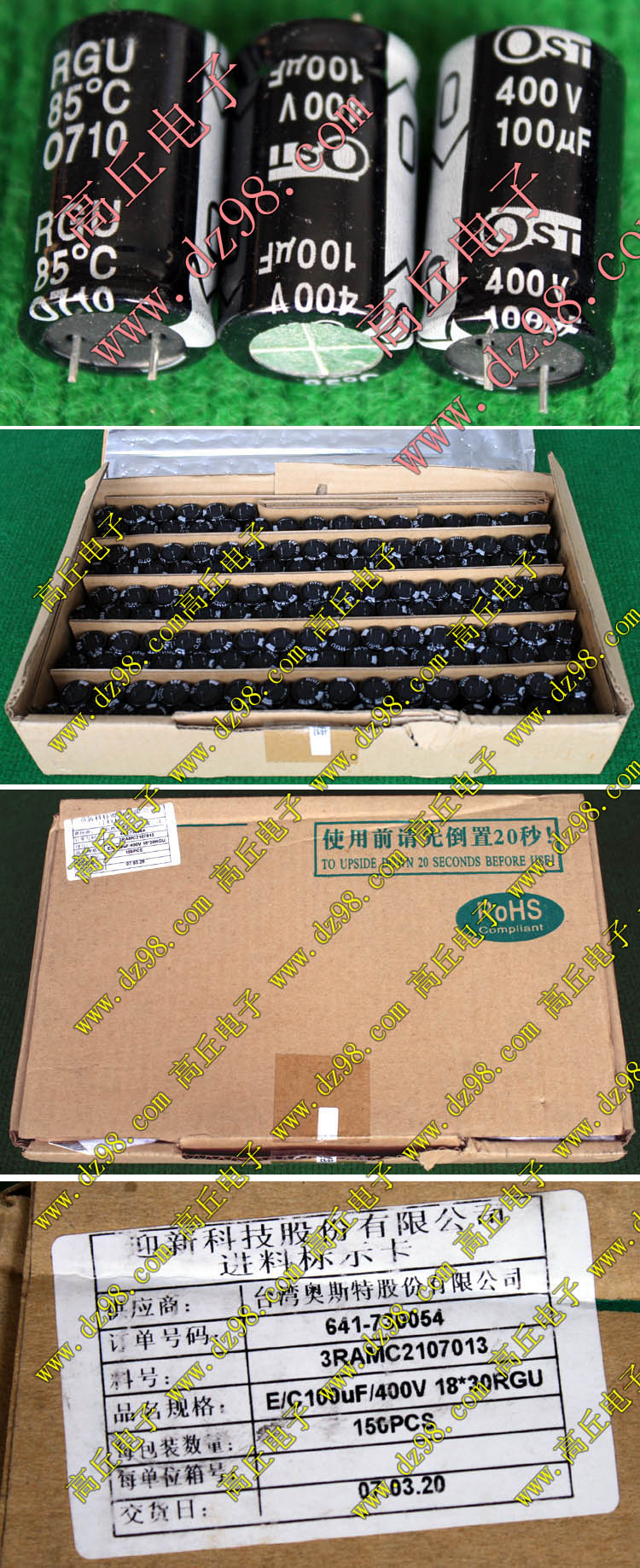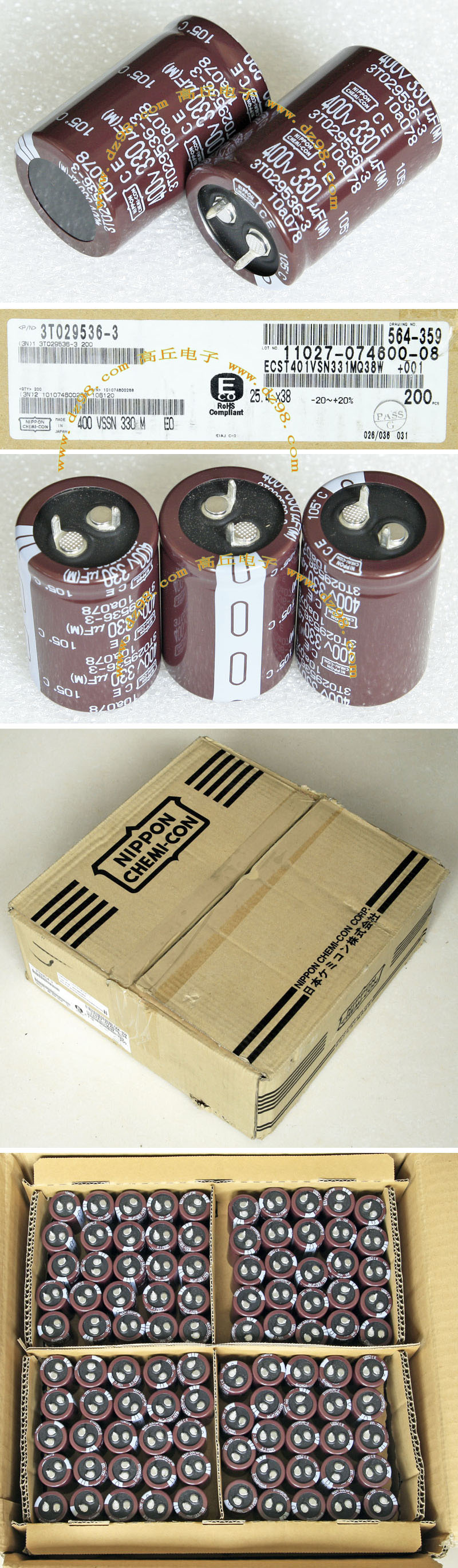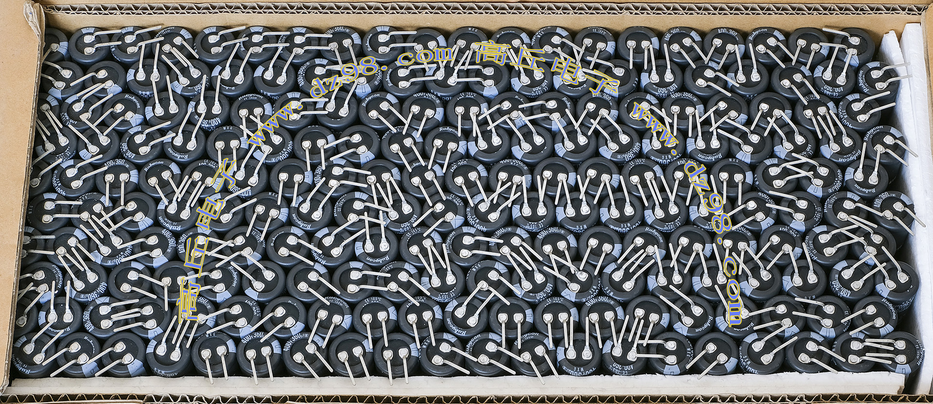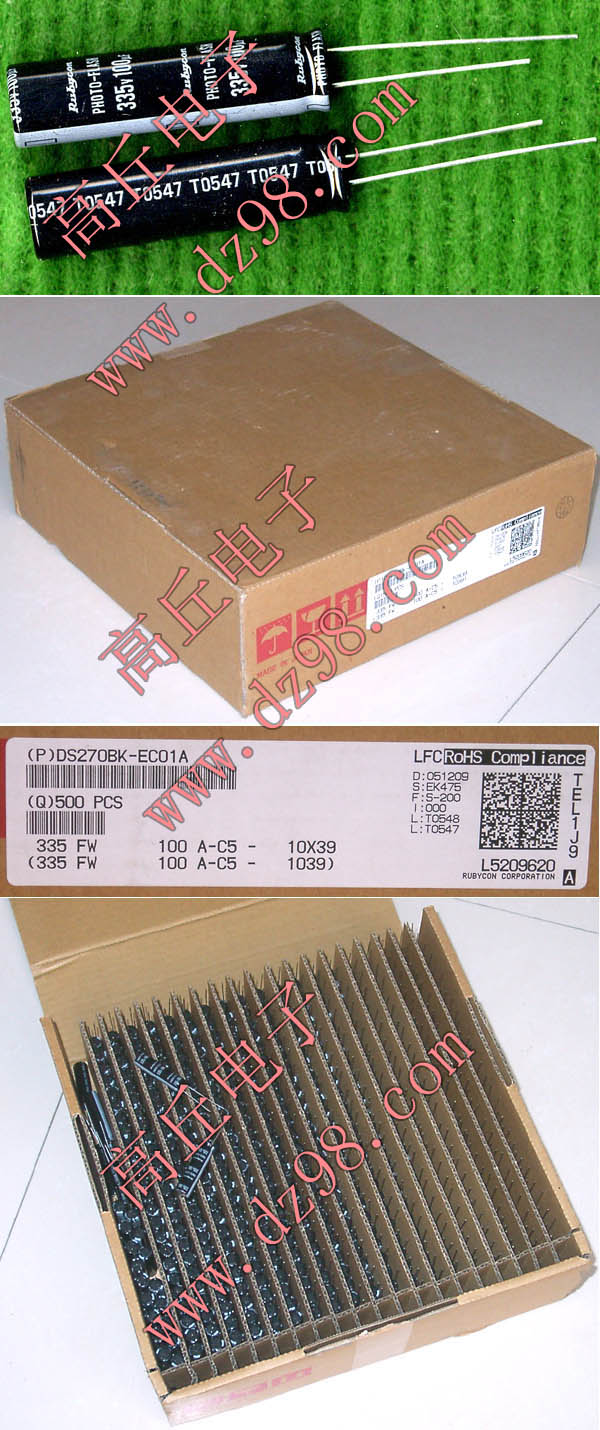 全新原装,每盒包装数量500只,整盒带包装重量约1357克。电容直径10.2毫米,高度20.2毫米。