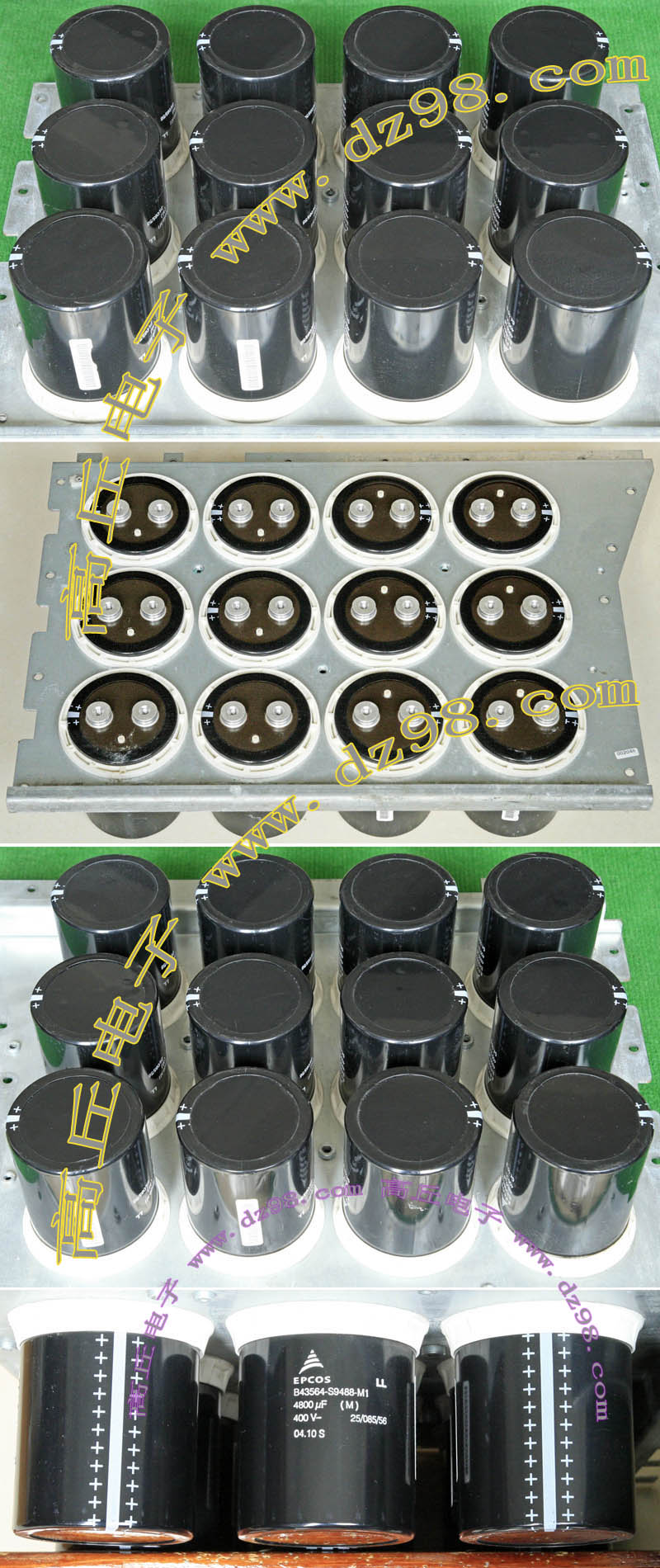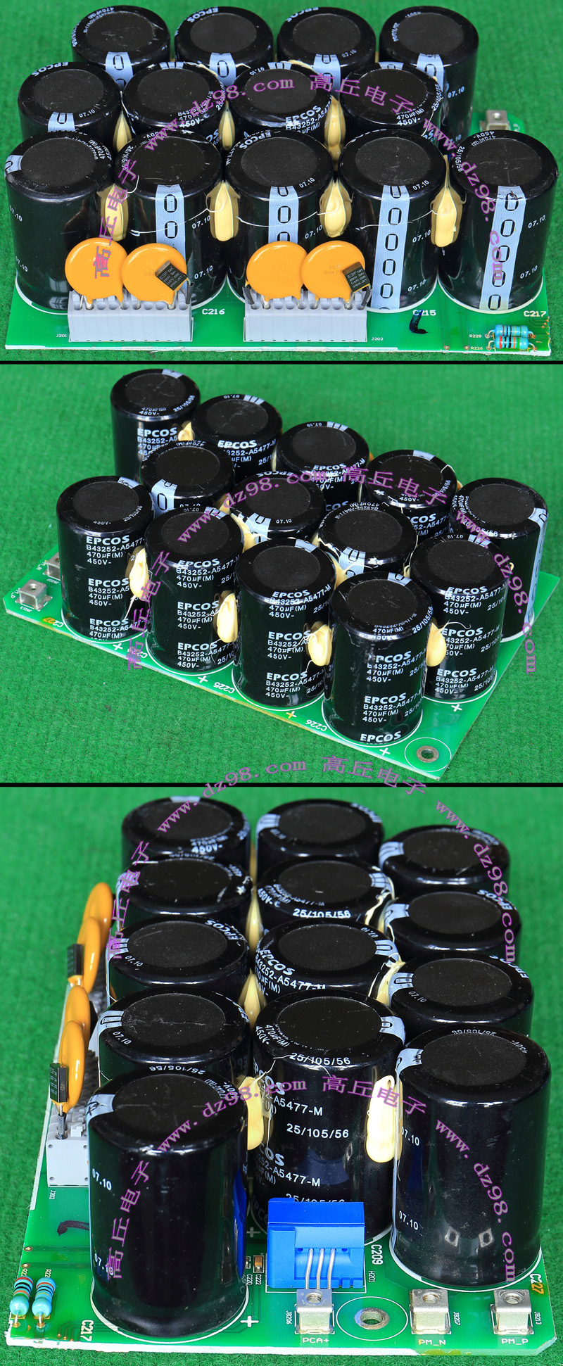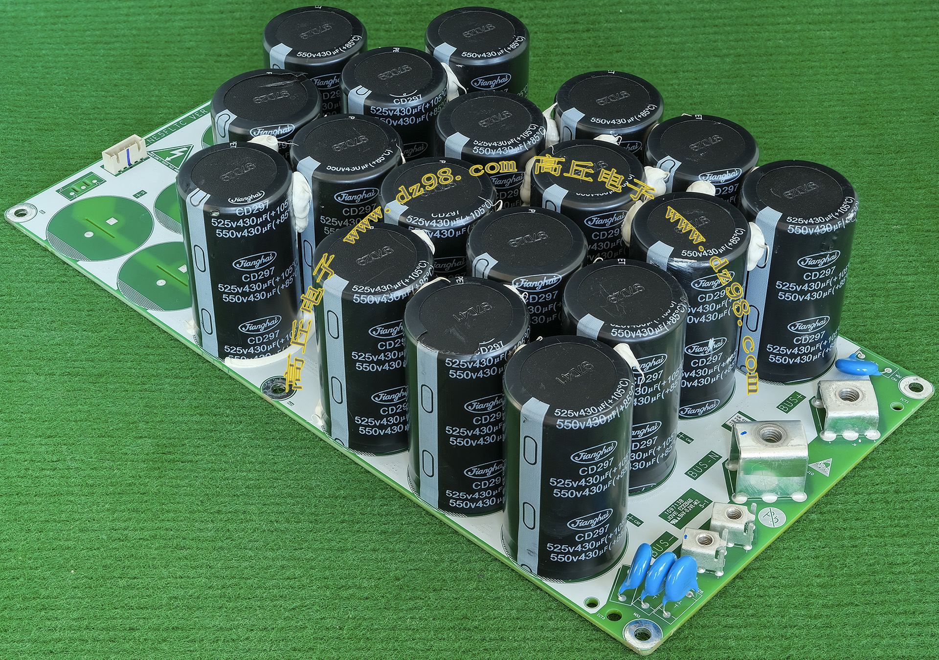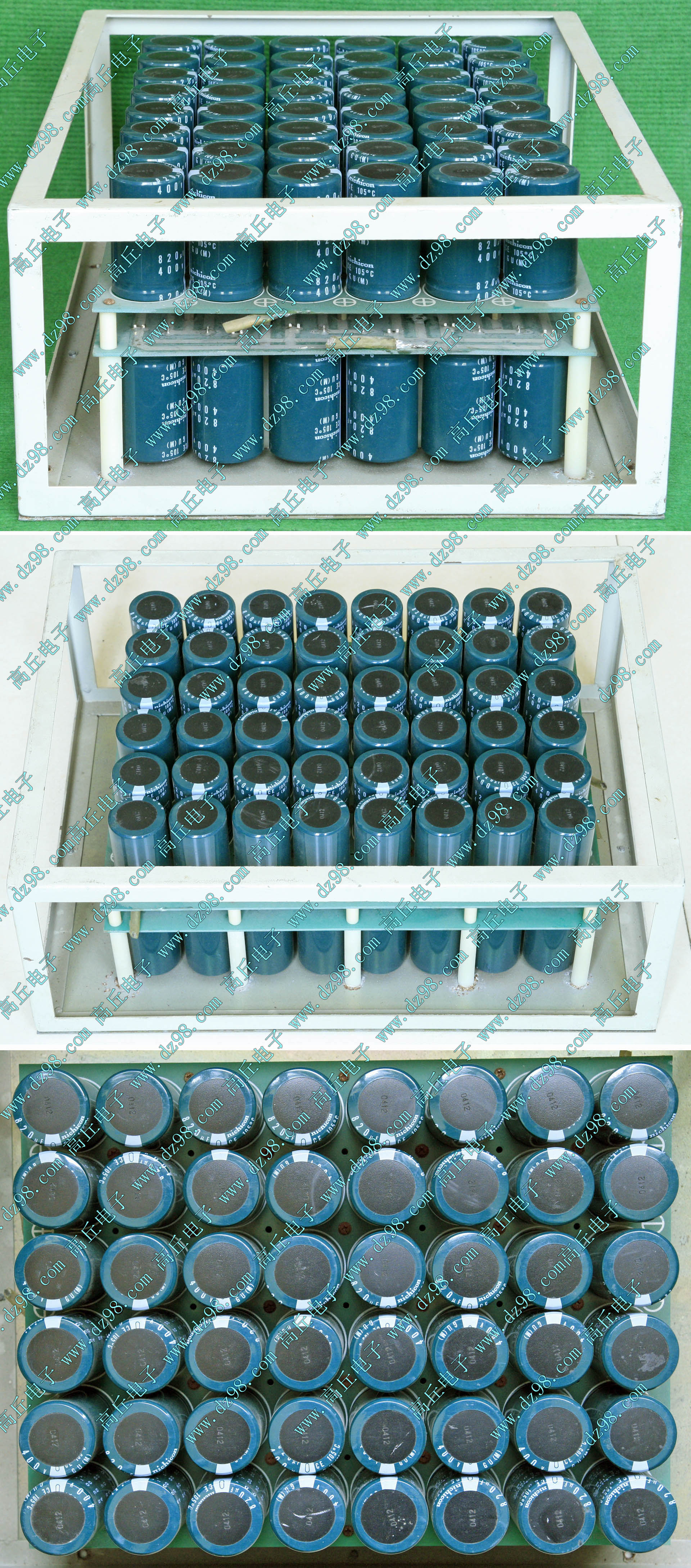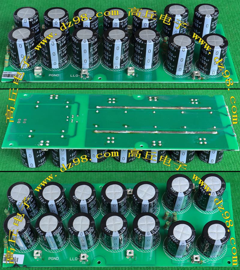 实物请看放大图片,每只电容直径35mm,高41mm。线路板尺寸175mm x 126mm,整体高度45mm。板上无其它元件,是一块由13只电容并联的滤波器板。