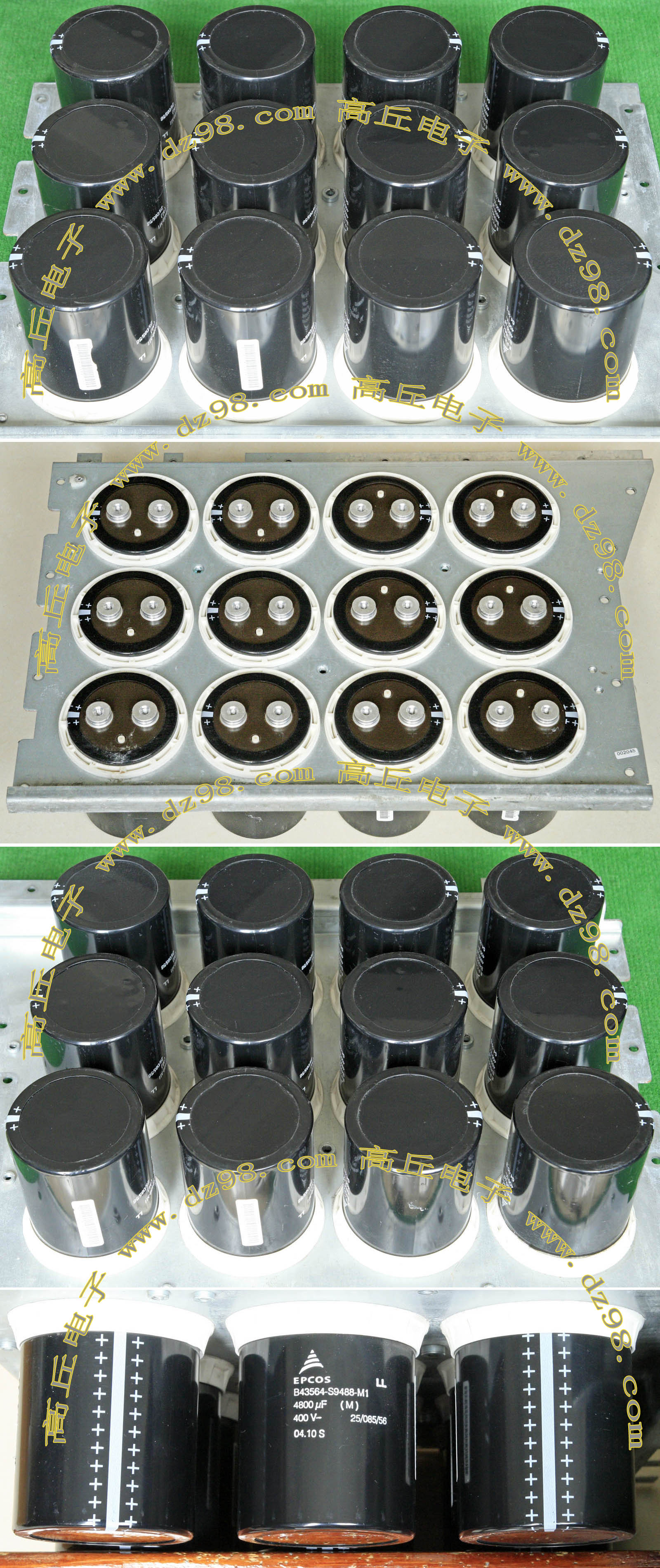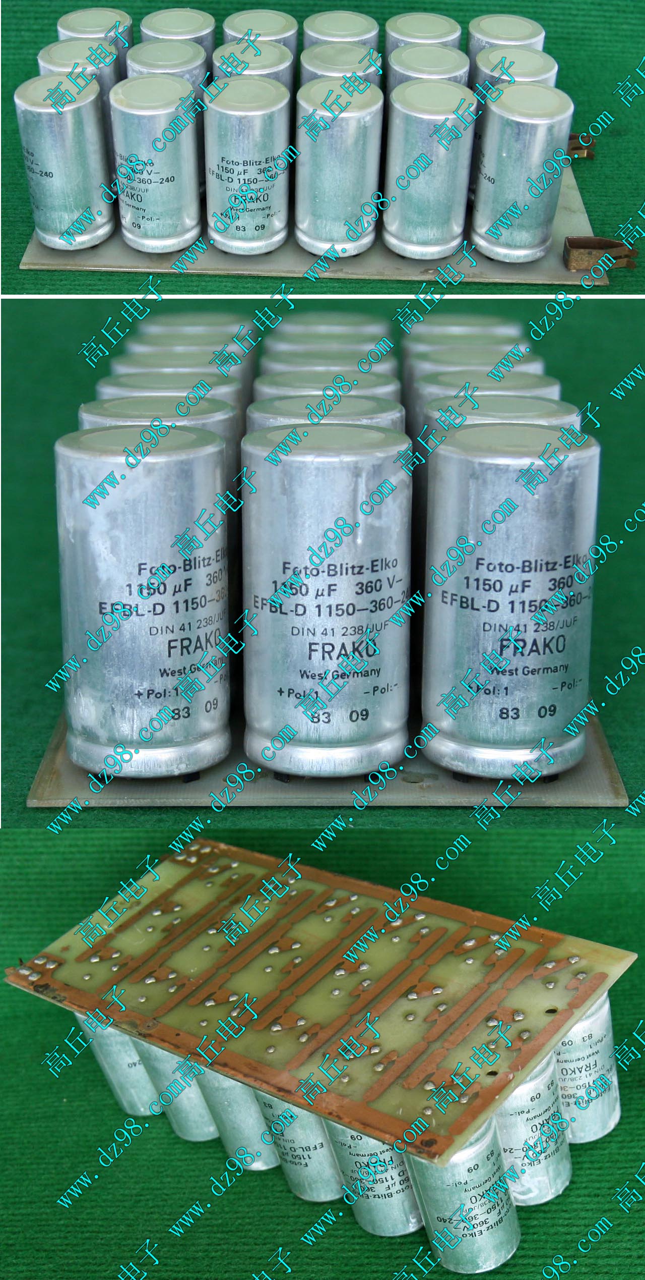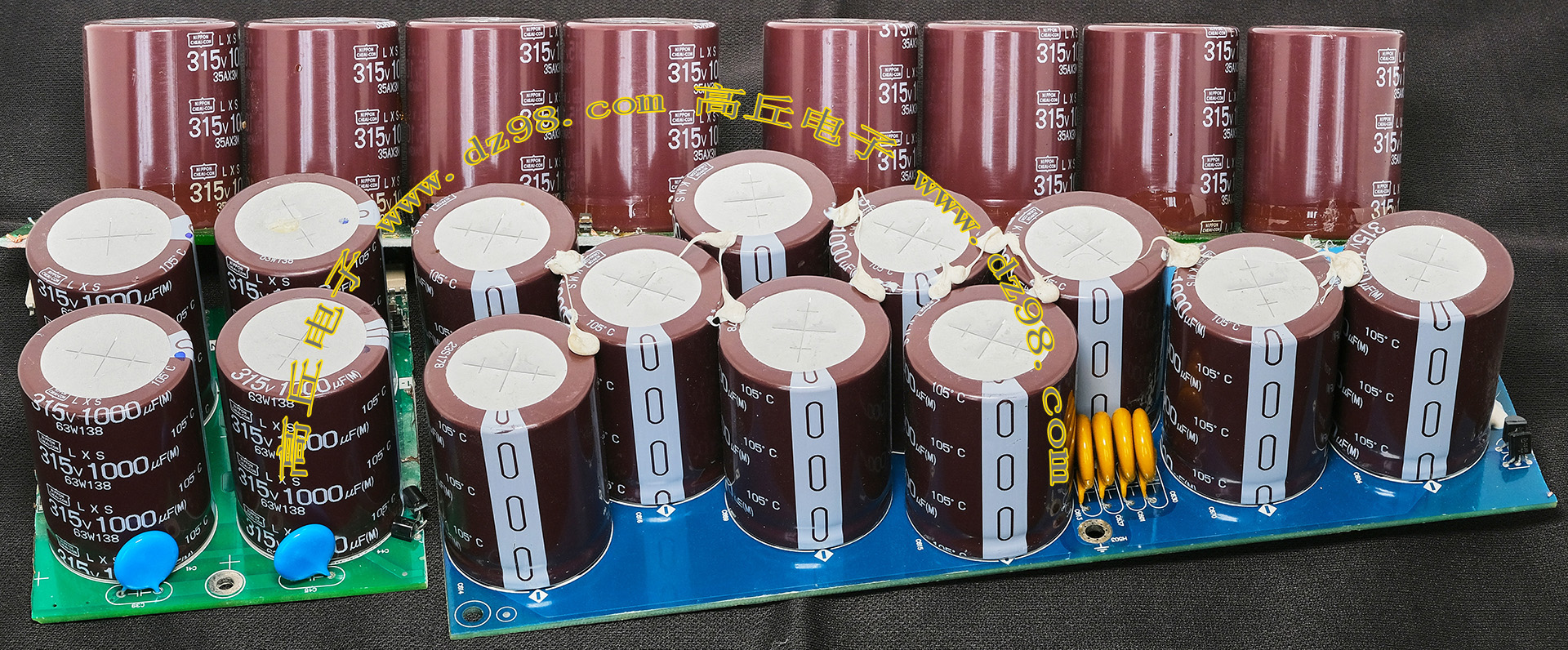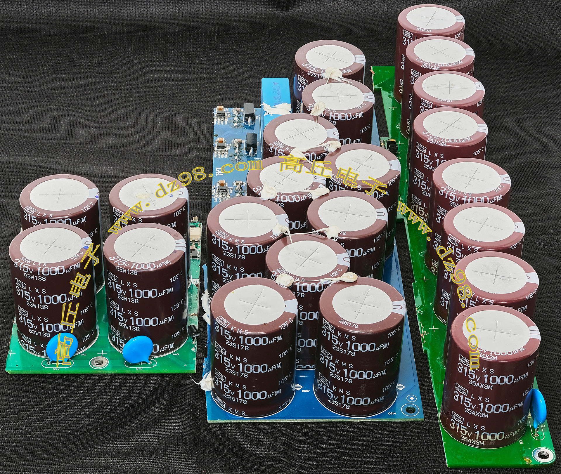 实物请看放大图片,每只电容直径35mm,高41mm。线路板尺寸175mm x 126mm,整体高度45mm。板上无其它元件,是一块由13只电容并联的滤波器板。