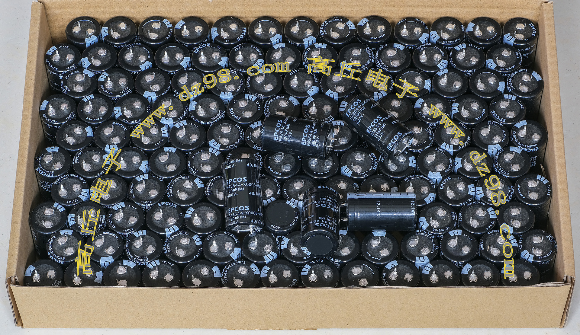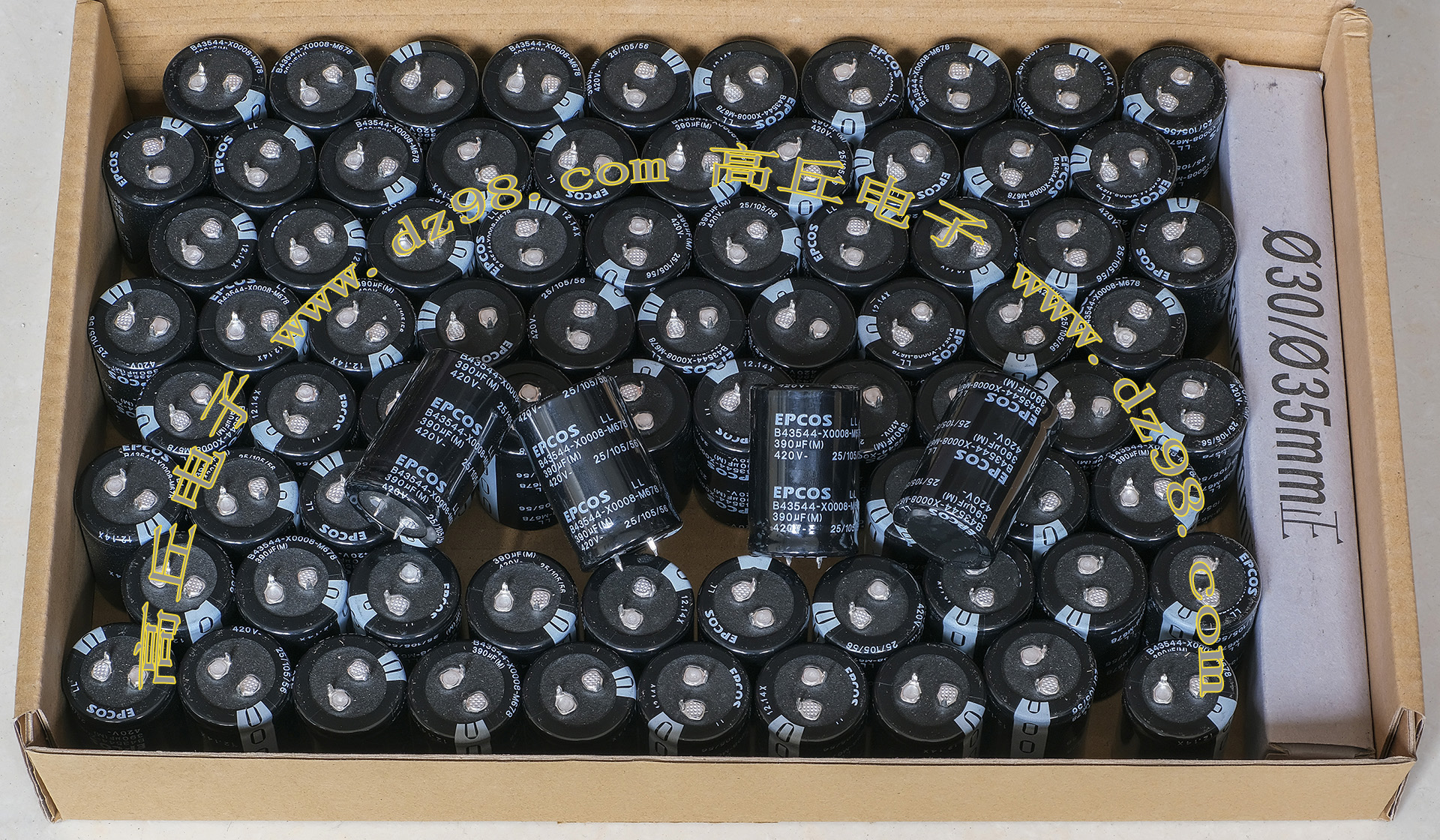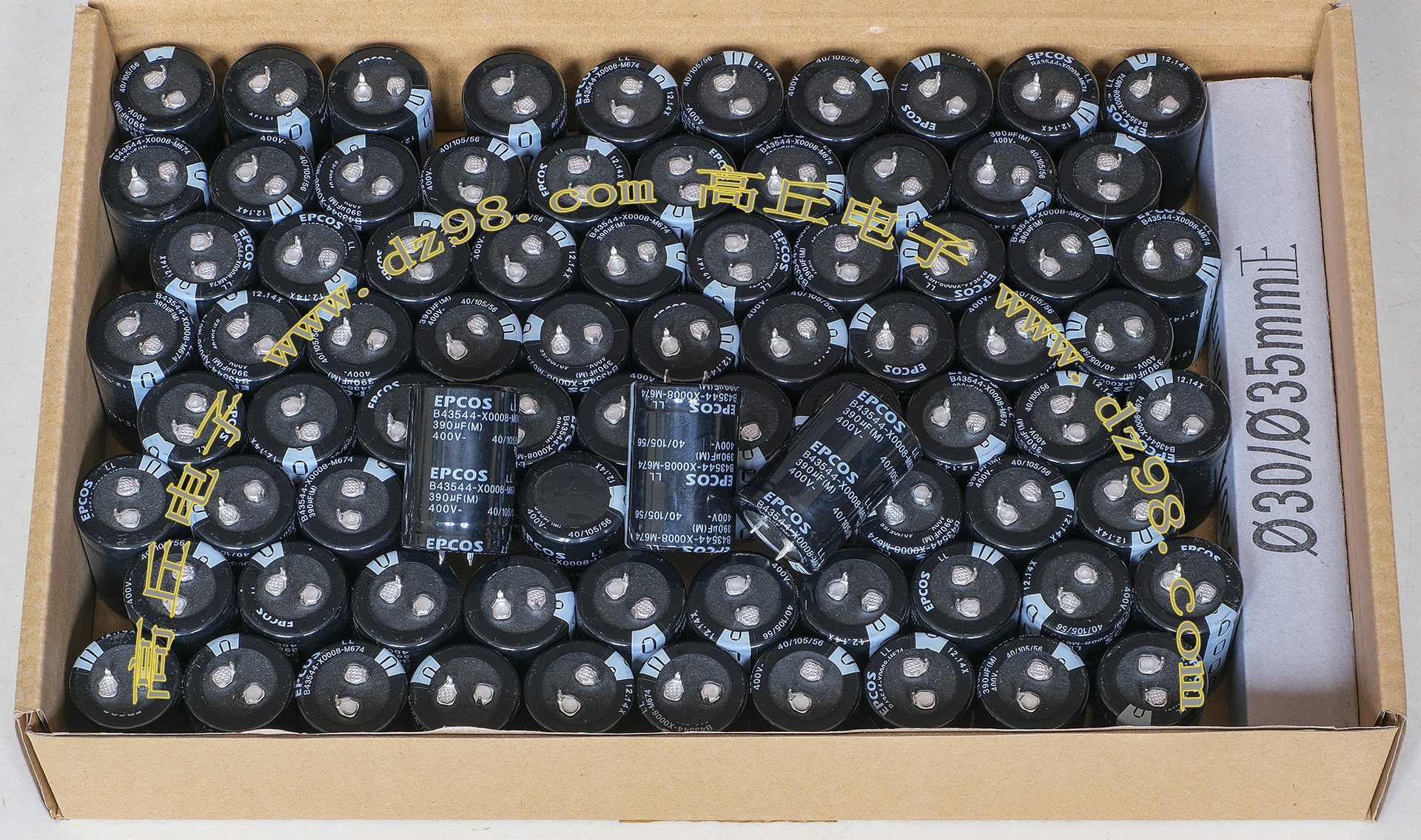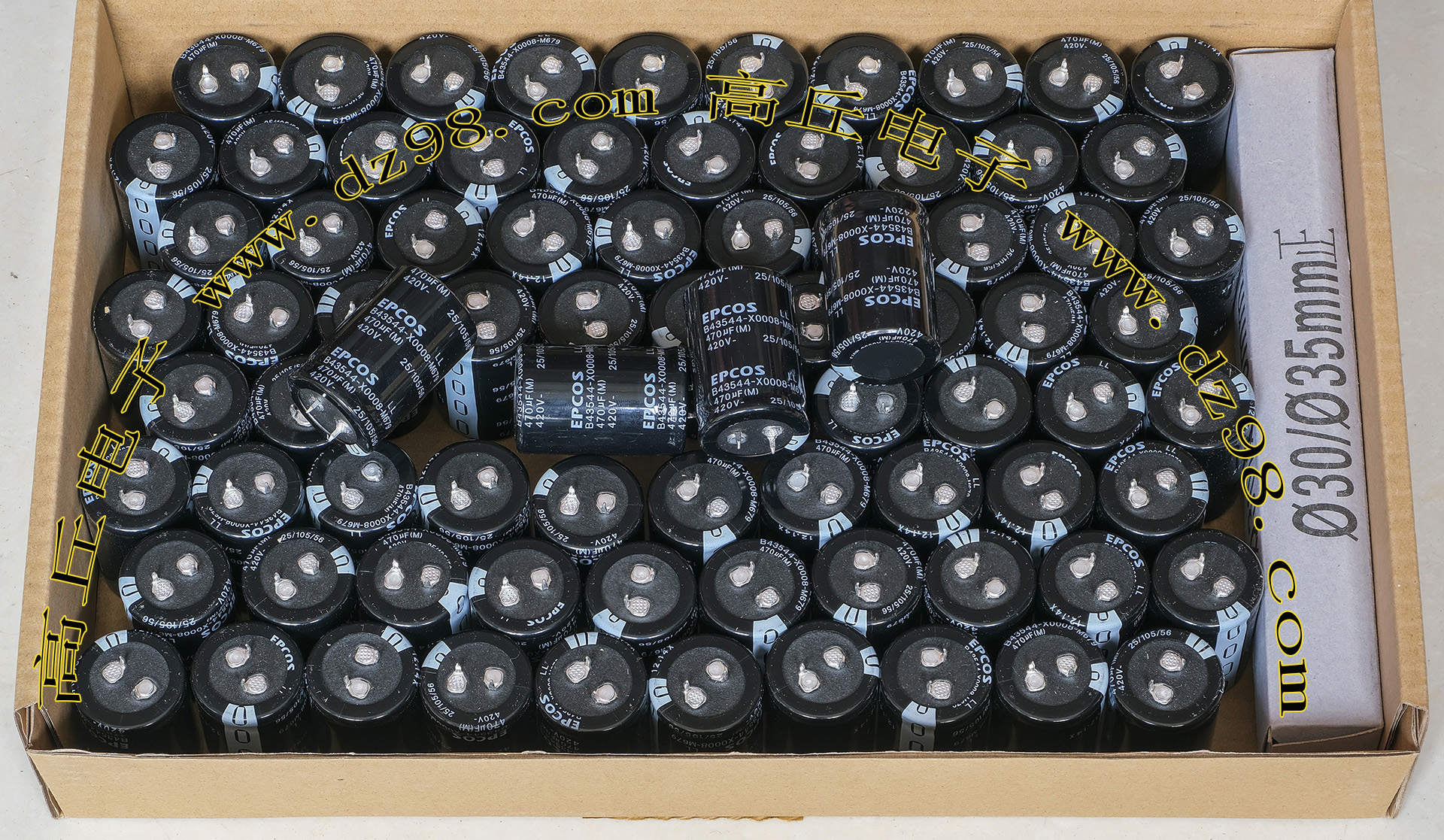 全新原装,每盒包装数量80只,整盒带包装重量约4080克。电容直径30.3毫米,高度46.2毫米。