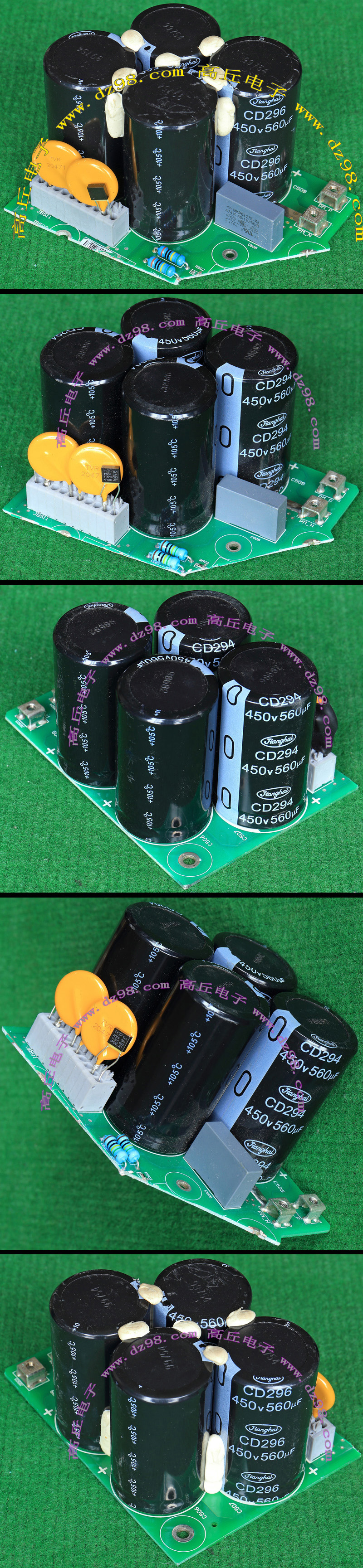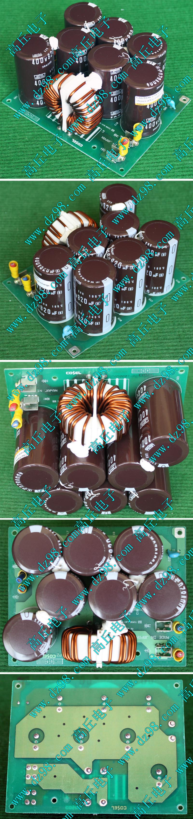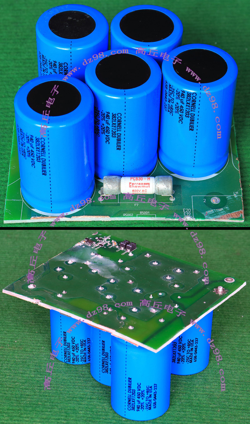 全新电源板切下连5只电容重量约480克,板上装配500V/470uF电容5只,电容直径35.5毫米,高度60毫米。带板发货送板上1只700V/1uF无极电容。