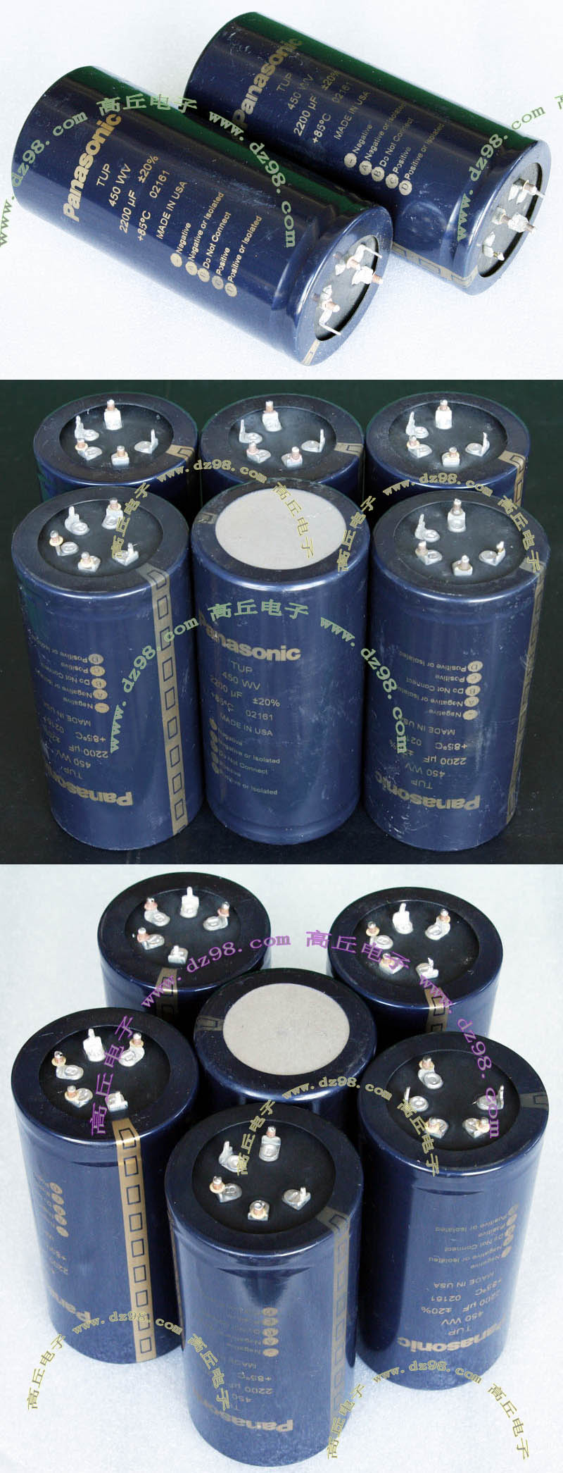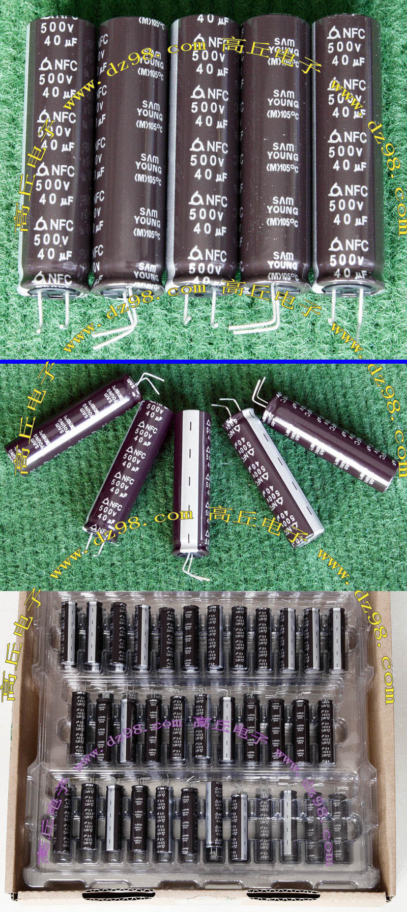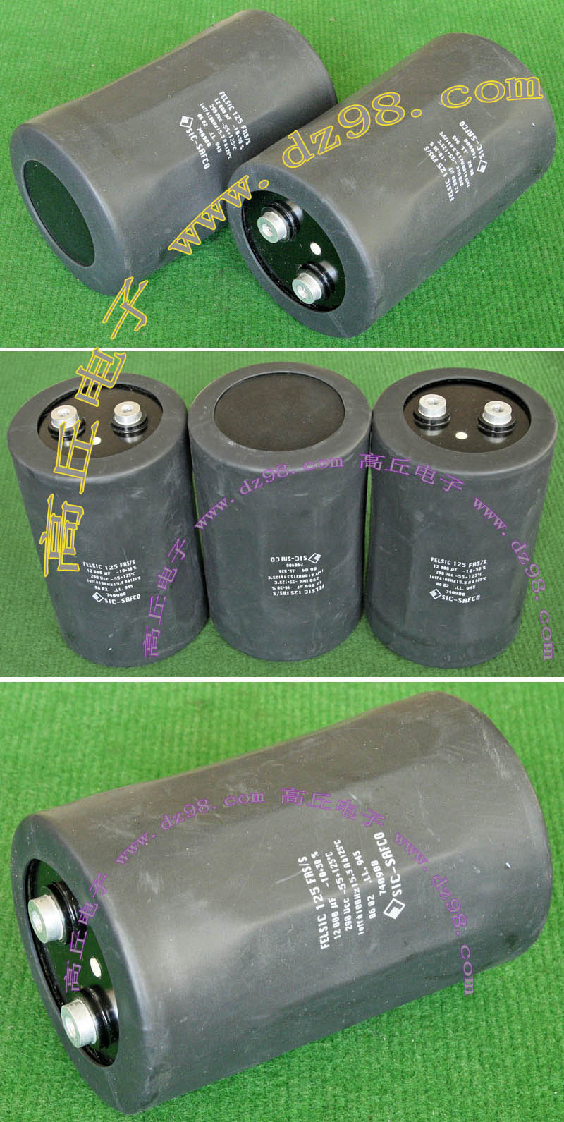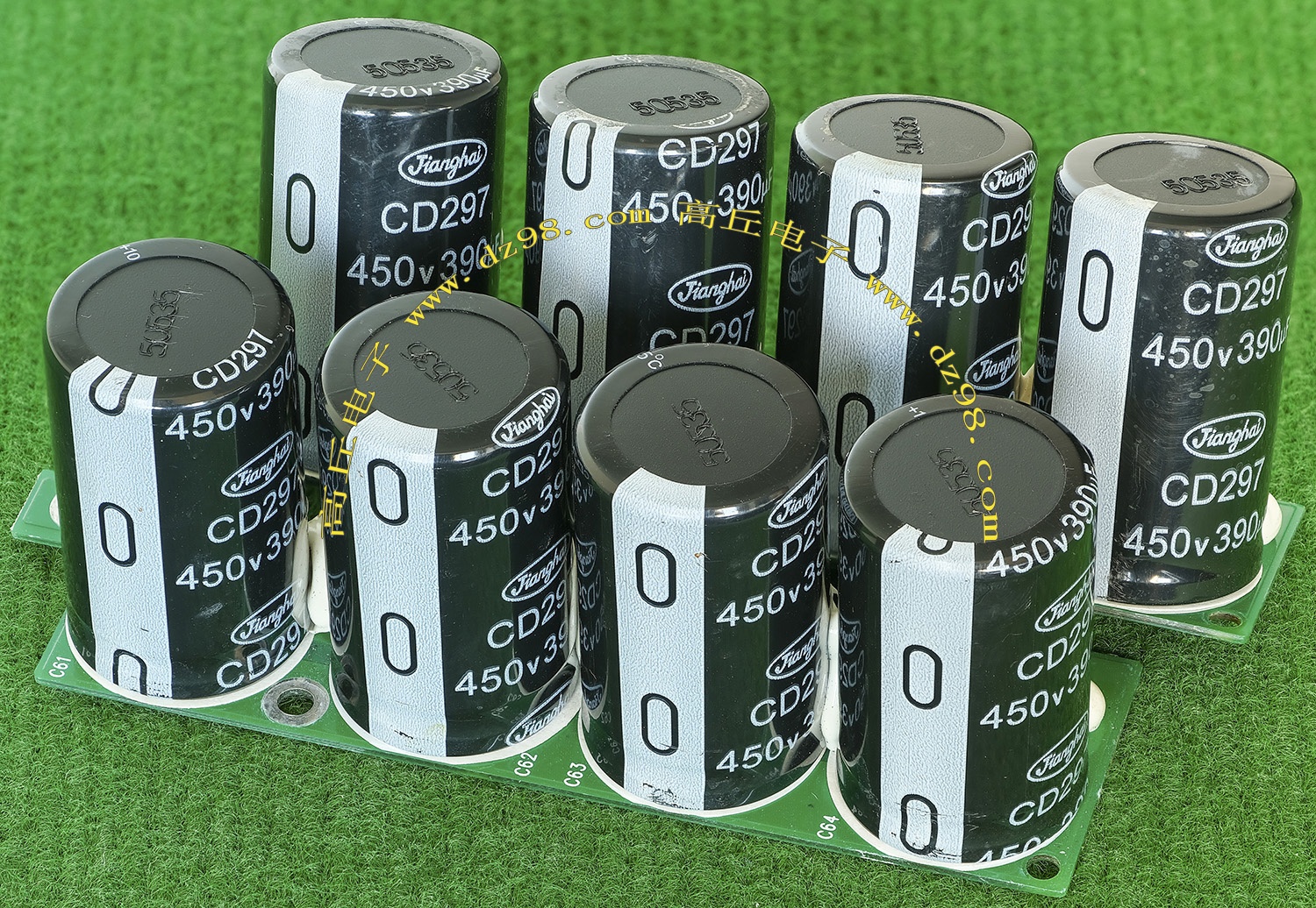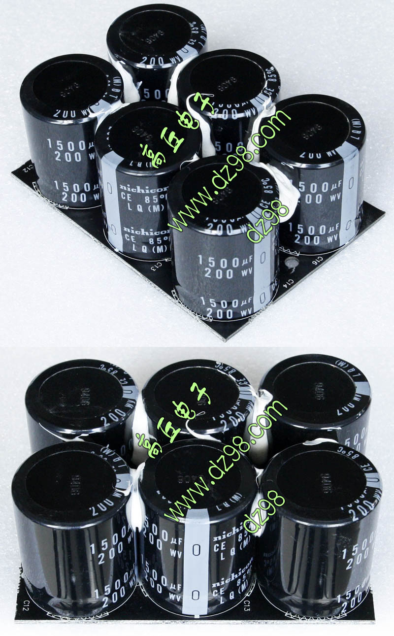 实物请看放大图片,每只电容直径35mm,高41mm。线路板尺寸141mm x 98mm,整体高度45mm。板上无其它元件,是一块由6只电容并联的滤波器板。