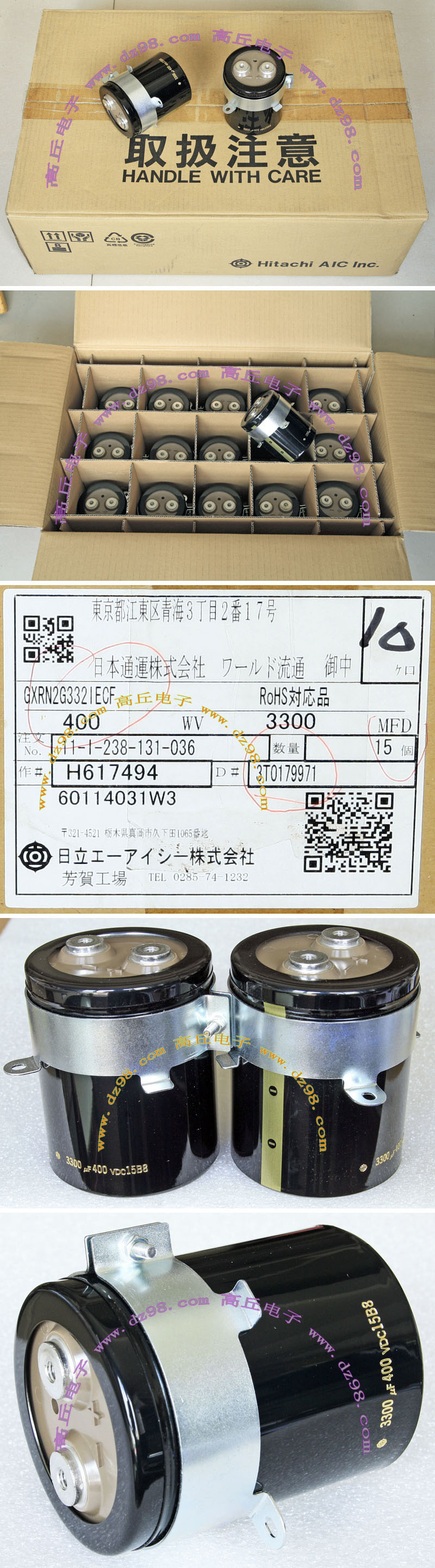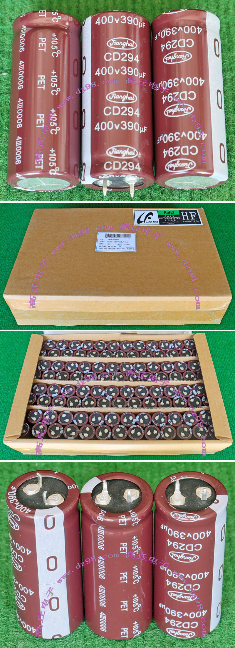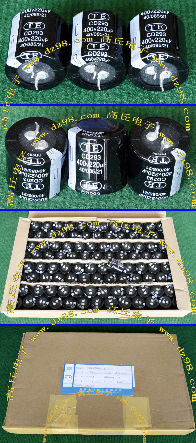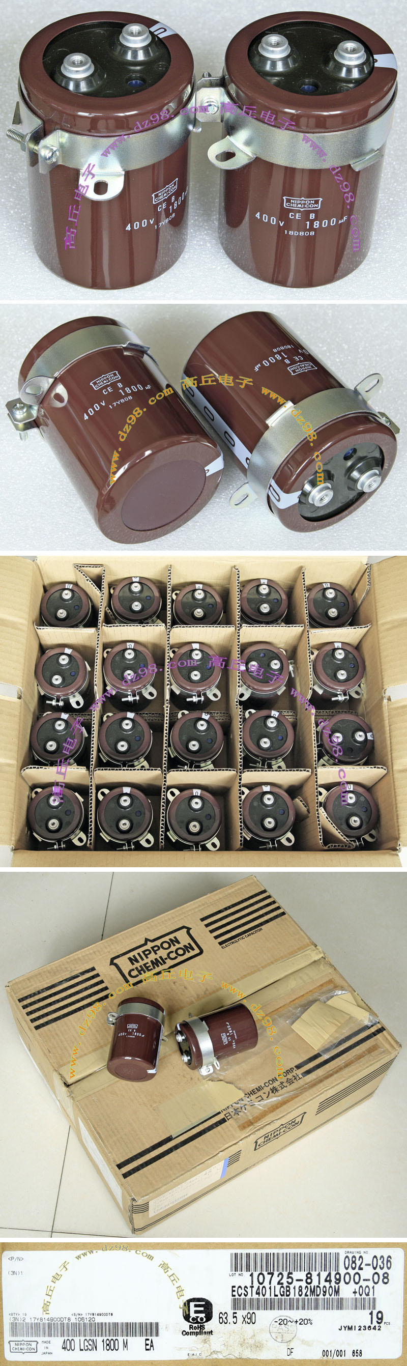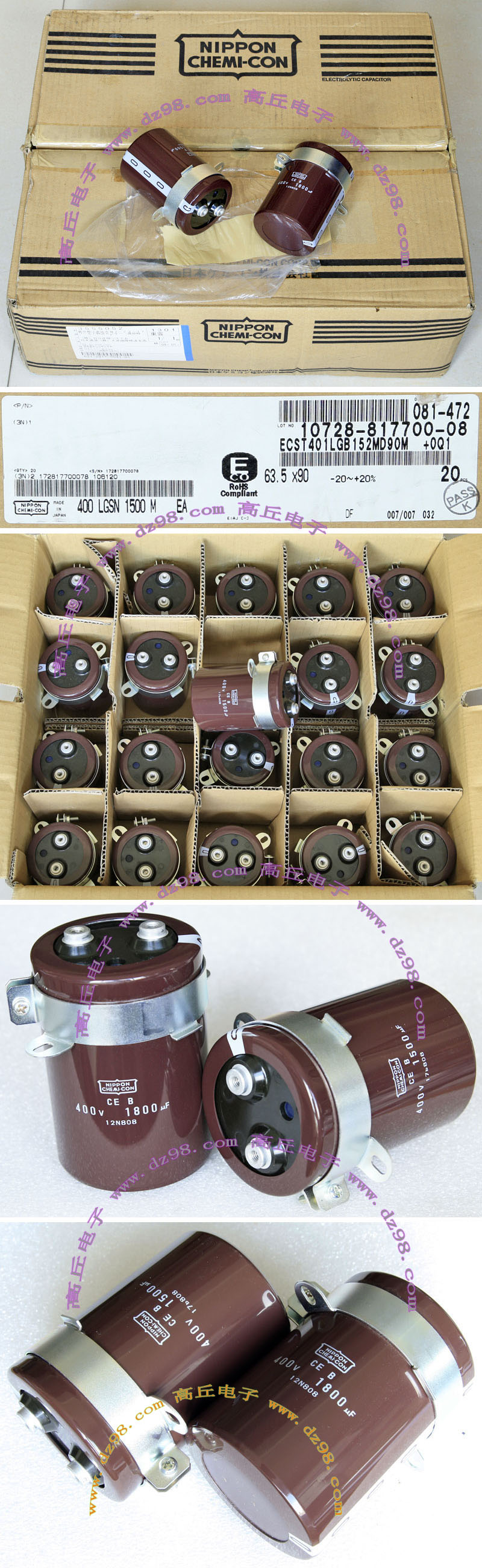 全新原装,每盒包装数量80只,整盒带包装重量约4570克。电容直径30.3毫米,高度46.2毫米。
