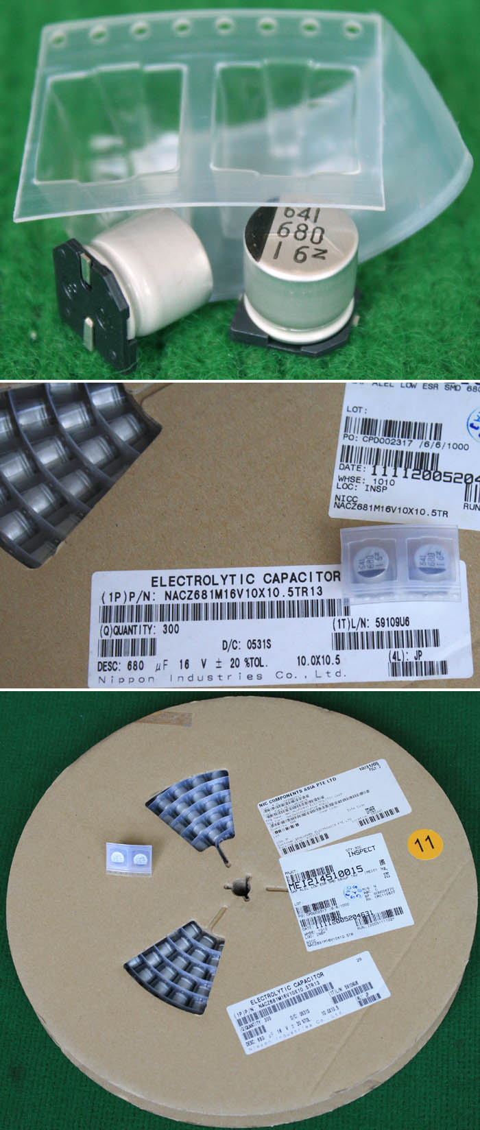 贴片封装,直径10mm,高度10.5mm,每圈包装数量300只。