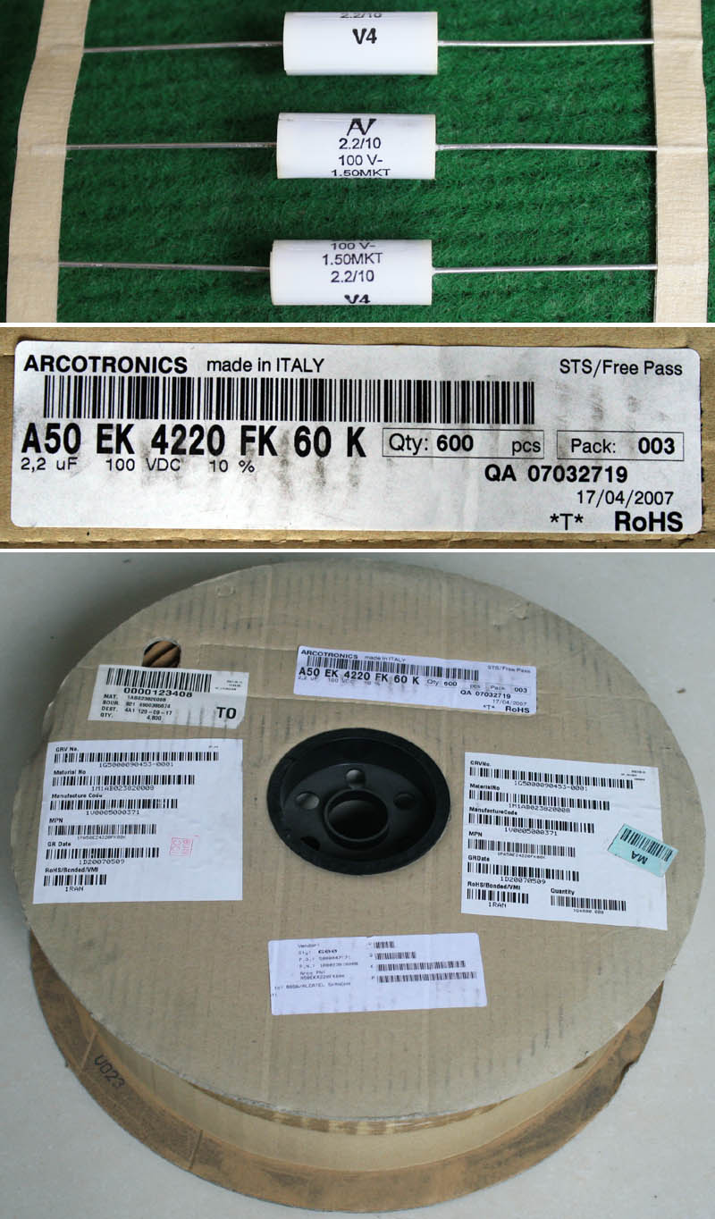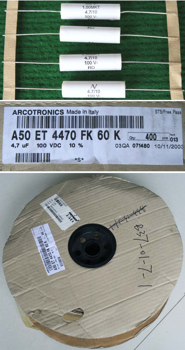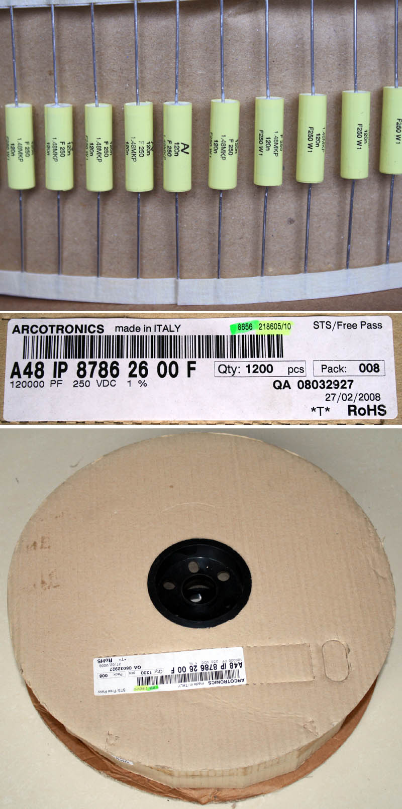 全新 | 全新, 产地:ITALY,电压250VDC,容量:12000PF=120nF=0.012uF,材料:1.48MKP,每圈包装数量1200克,每盘重量约1500克。电容体长度19mm, 直径6mm,总长度72mm。 |