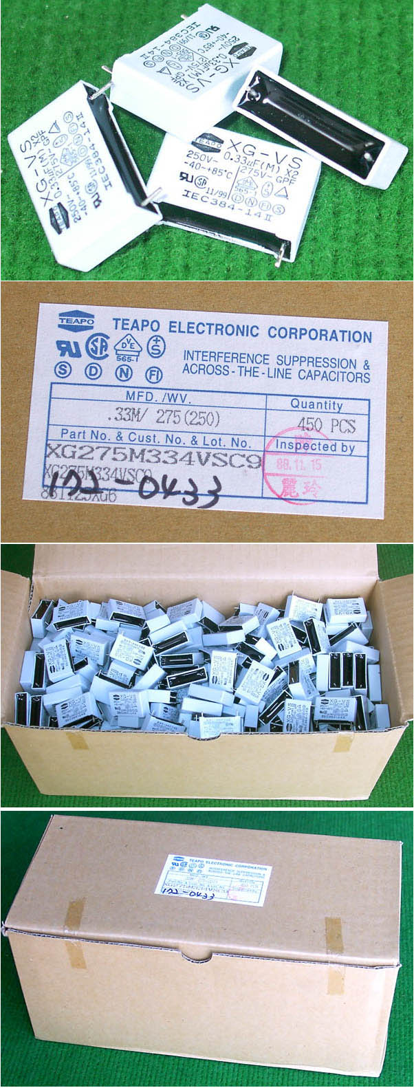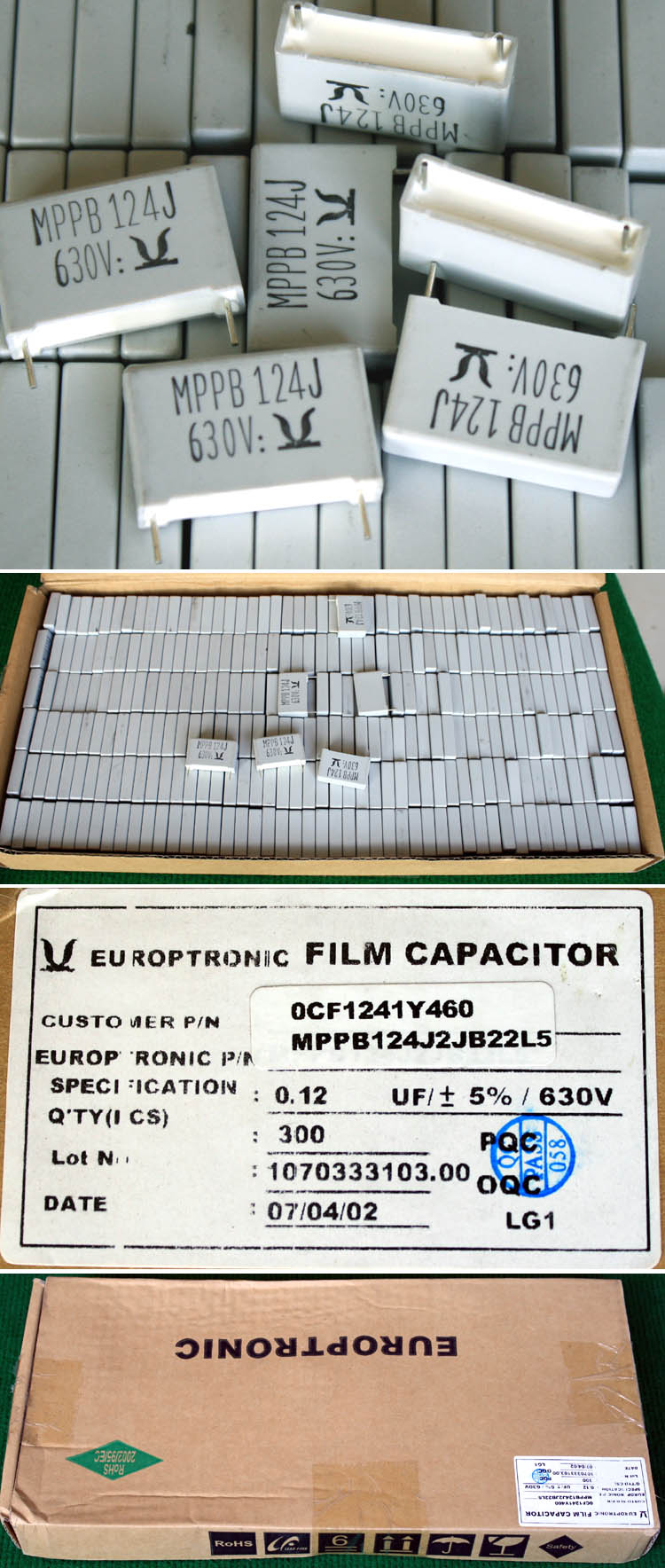 每盒包装数量300只,每盒重量约1200克,脚距22.5mm,0.12uF,电压630V。