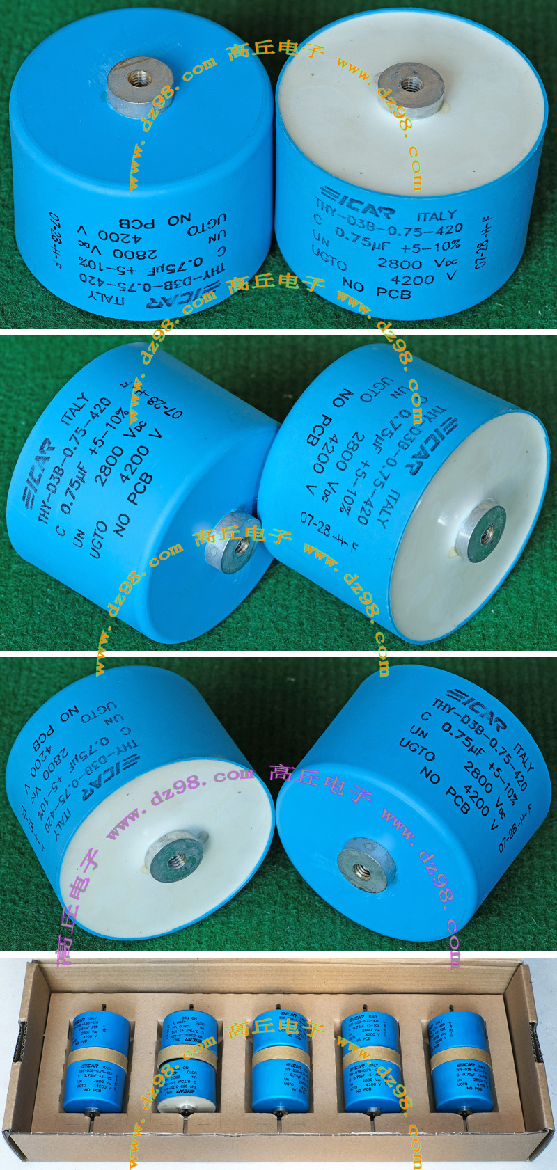 全新原装,每盒包装数量10只,容量0.75uF,电压2800-4200V,大电流铜接线端子,直径70毫米,高度58毫米,重量约240克。