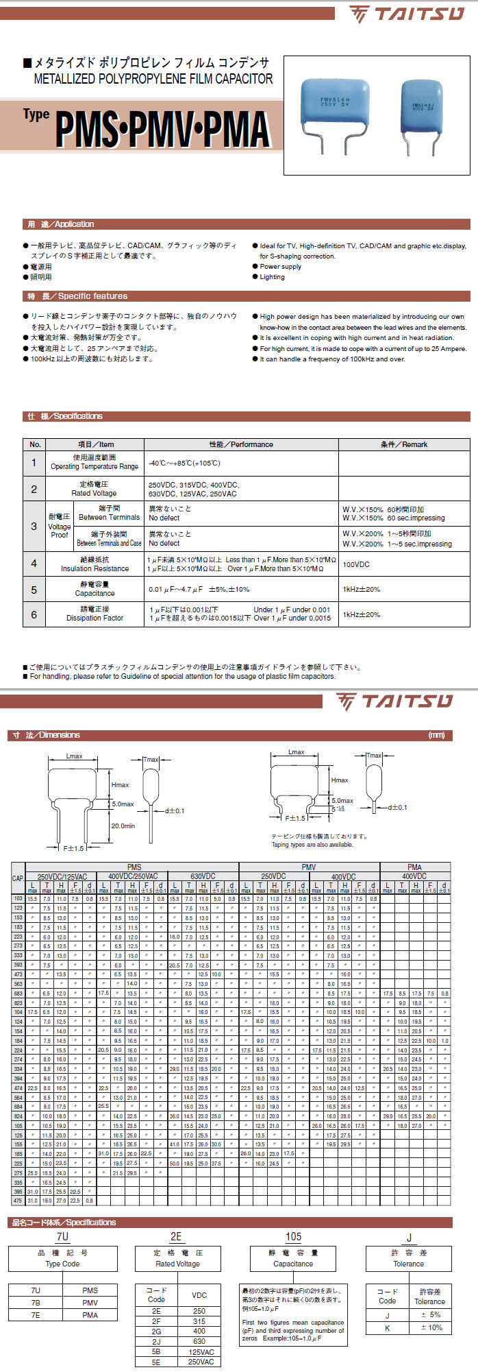 | TAITSU PMS225J2E 2.2uF 250V进口无感薄膜电容BWM36 | 原装进口,每袋包装数量100只,每袋重量约525克。外形尺寸:21毫米x13毫米,高度22毫米,脚距10毫米,可以调整为10-25毫米之间。 | 单价0.6元。 |