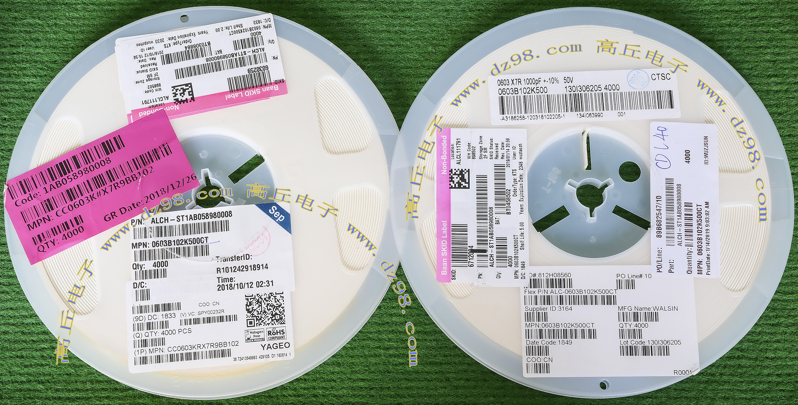 | 0603B102K500CT 1000pF 50V 贴片 金属固体 高频多层陶瓷电容BWo40 | 全新 | 全新,每盘包装数量4000只。 |