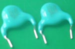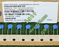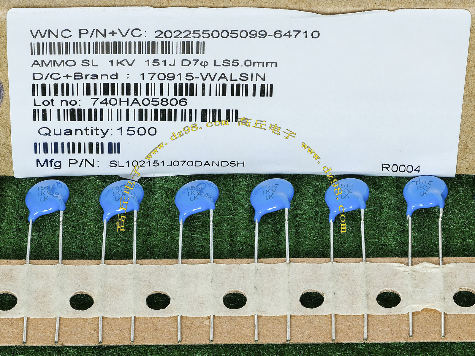 全新电容,容量150PF,电压1000VDC,每盒包装1500只(连盒重量约760克),直径7.5毫米,厚度2.7毫米,脚距5毫米。 |