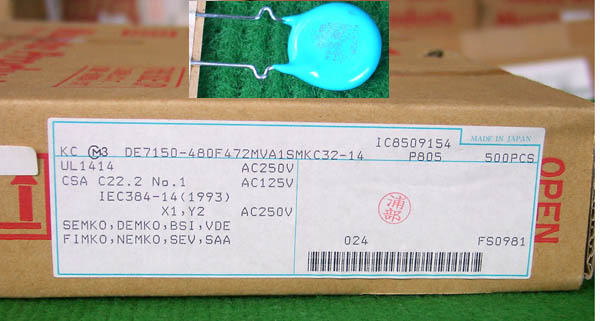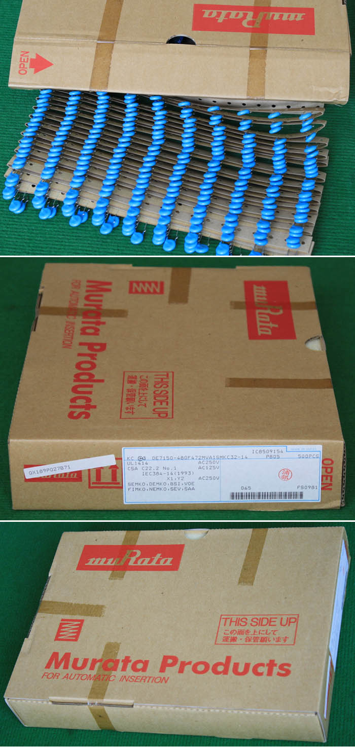 全新X1,Y2电容,产地日本,厂牌MURATA,4700PF,250VAC,每盒包装500只。 |