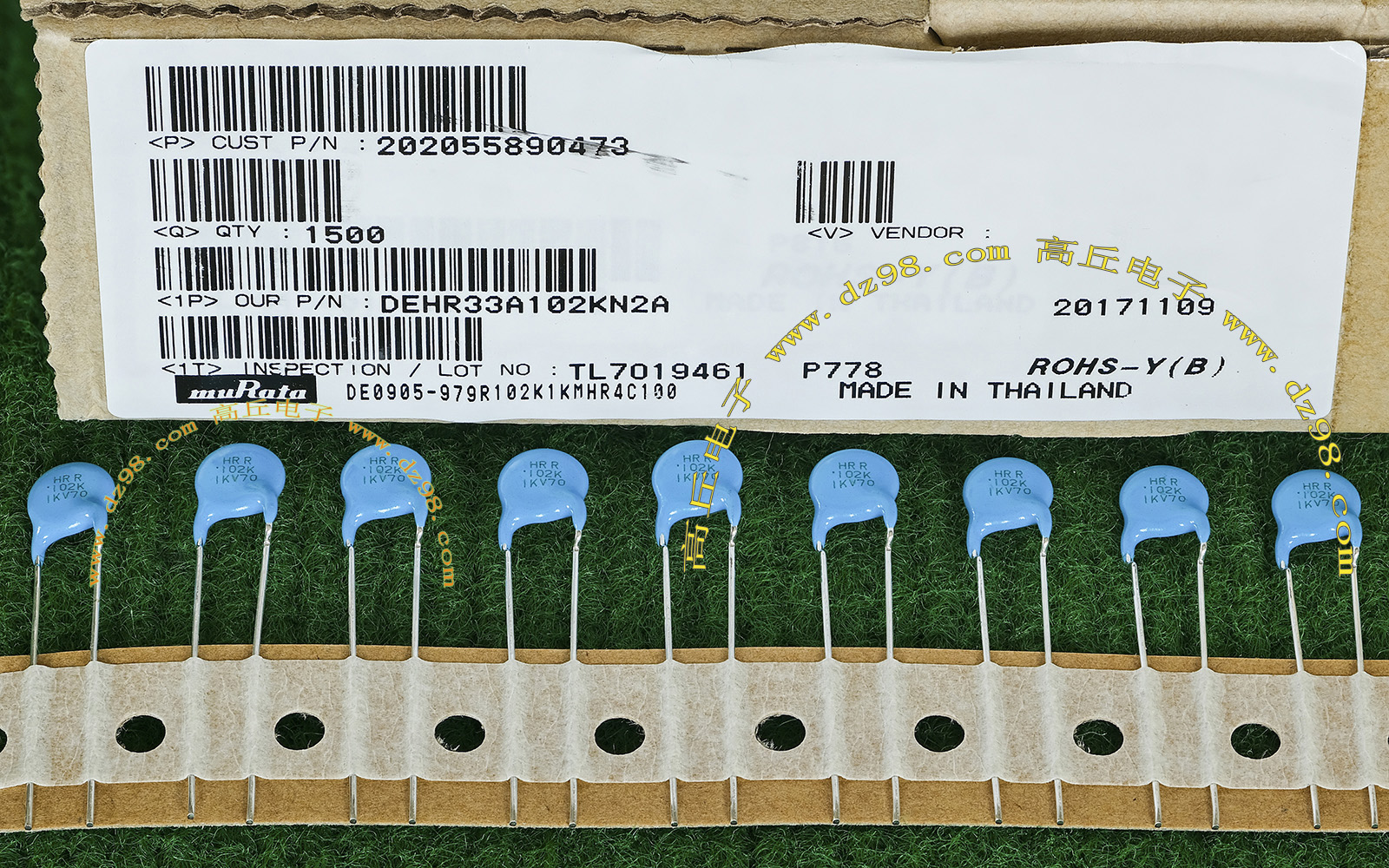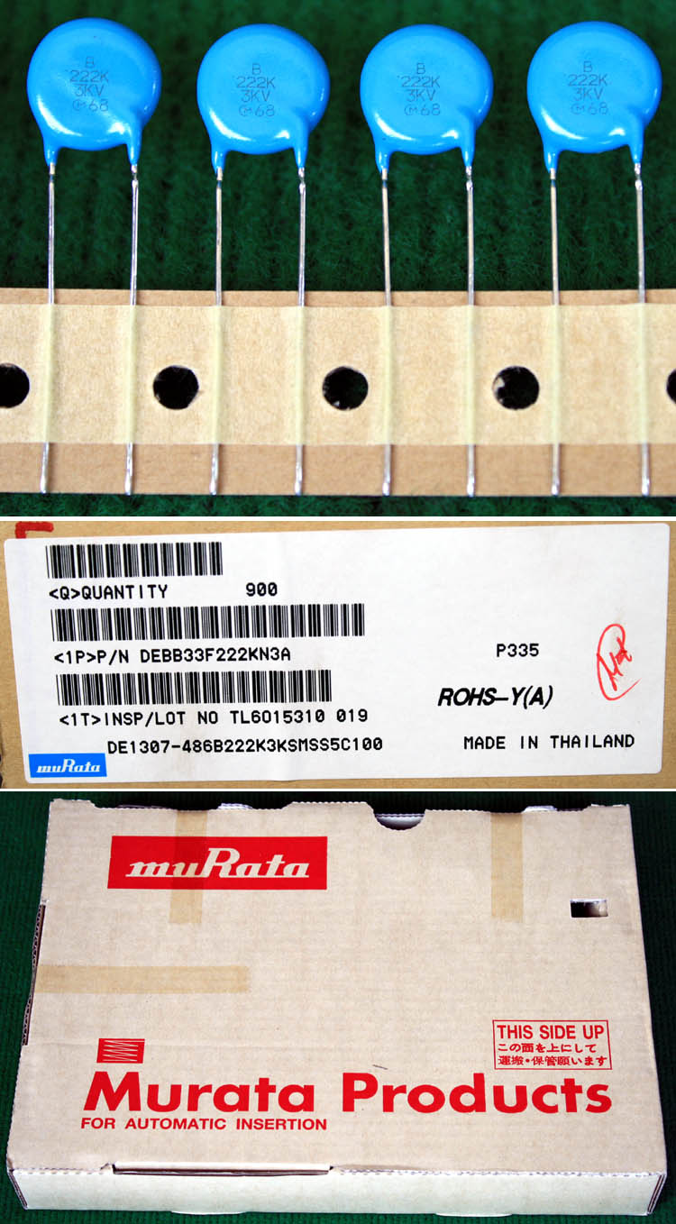 全新电容,厂牌:日本村田MURATA,产地:THAILAND,容量2200PF,电压3000VDC,每盒包装900只。 |