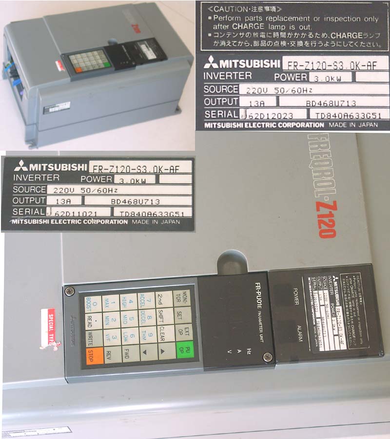 ![]() 3KW三菱FR-Z120变频器CA24,拆机件,输入单相220V,输出三相220V。 外观8.5成新,单价1100元。数量1只 |