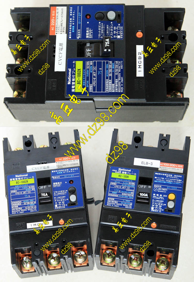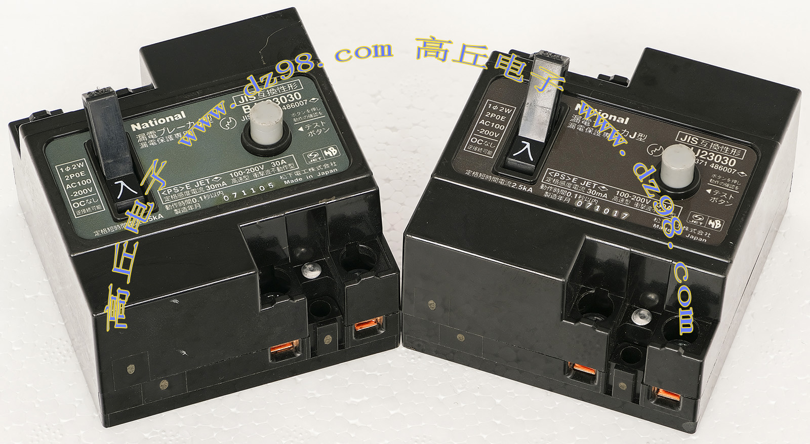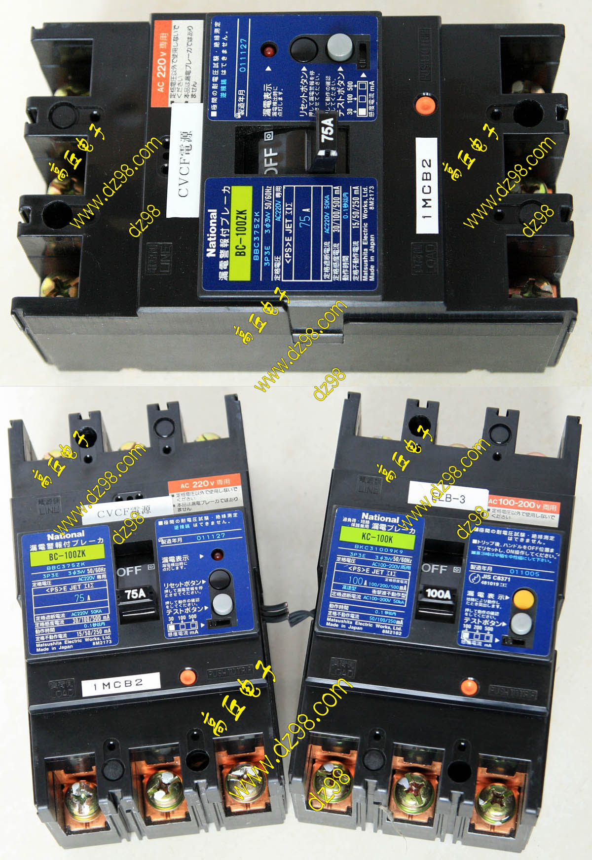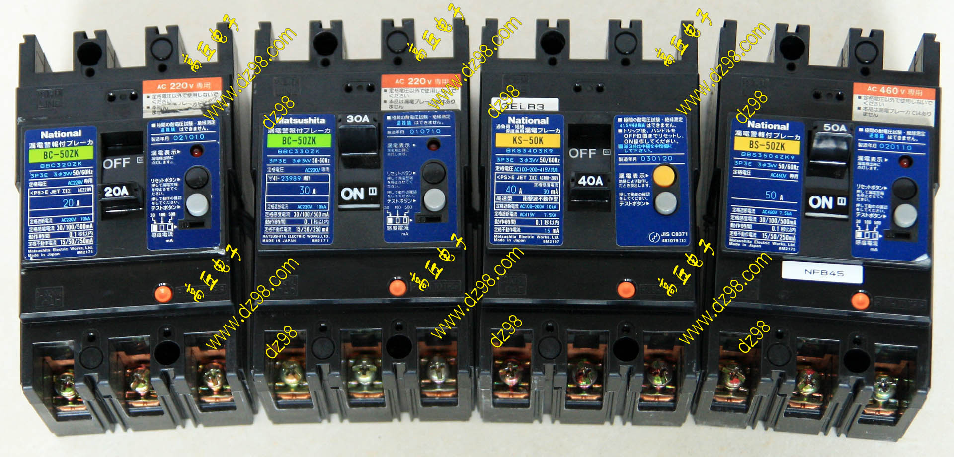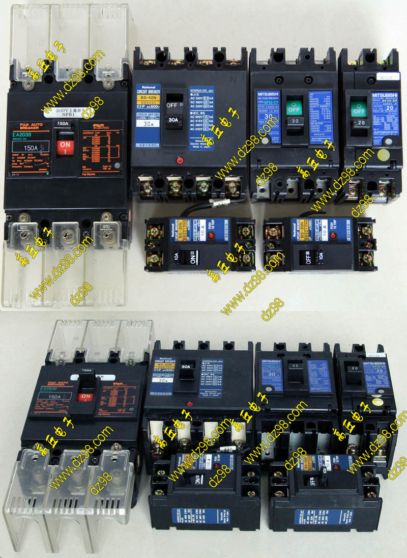 ,外观约8成新,产地日本,实物看图,导轨卡装或平面安装,10A空气开关重量约200克,三相漏电开关重量约220克,单相漏电开关重量约150克,漏电动作电流30毫安。