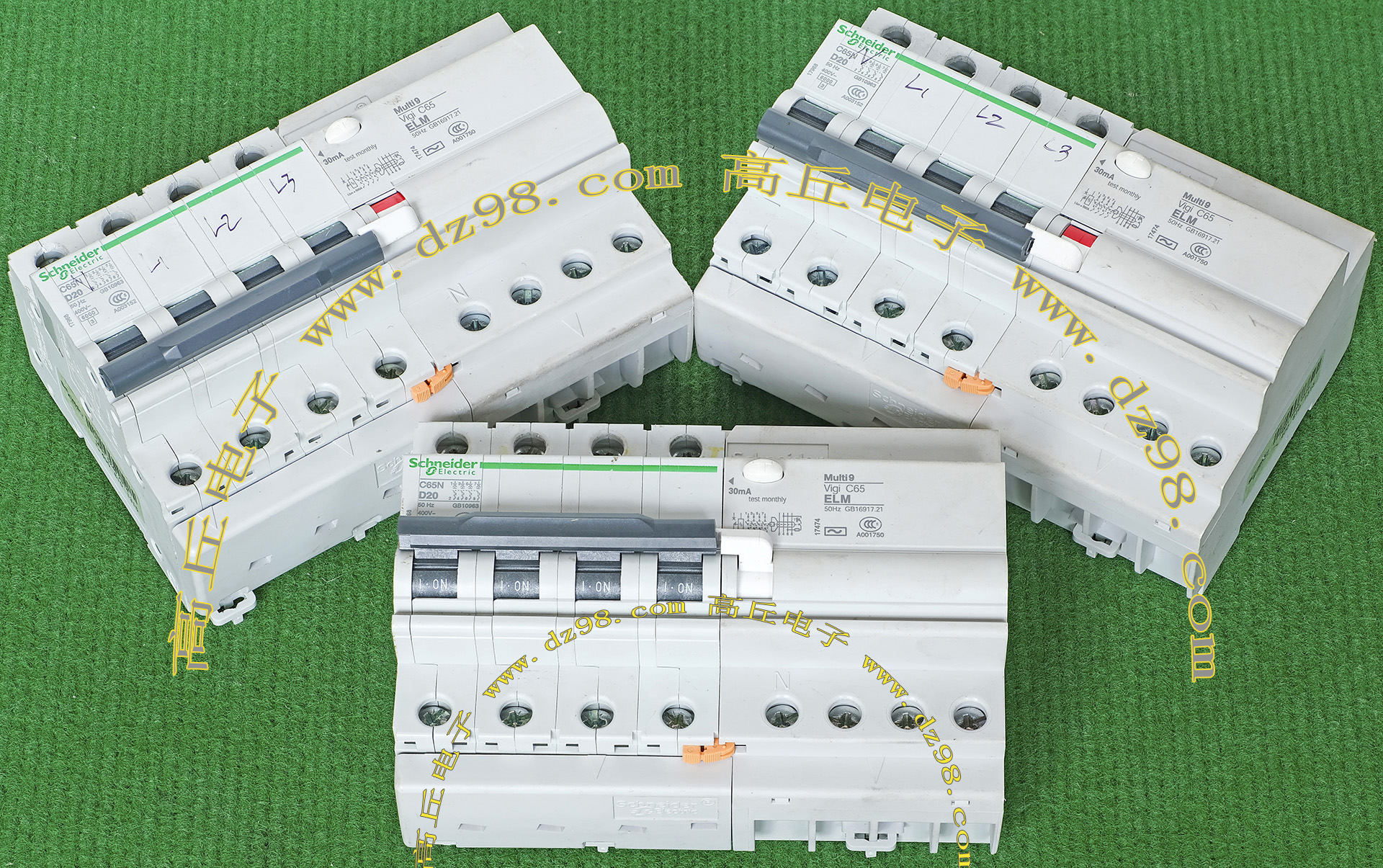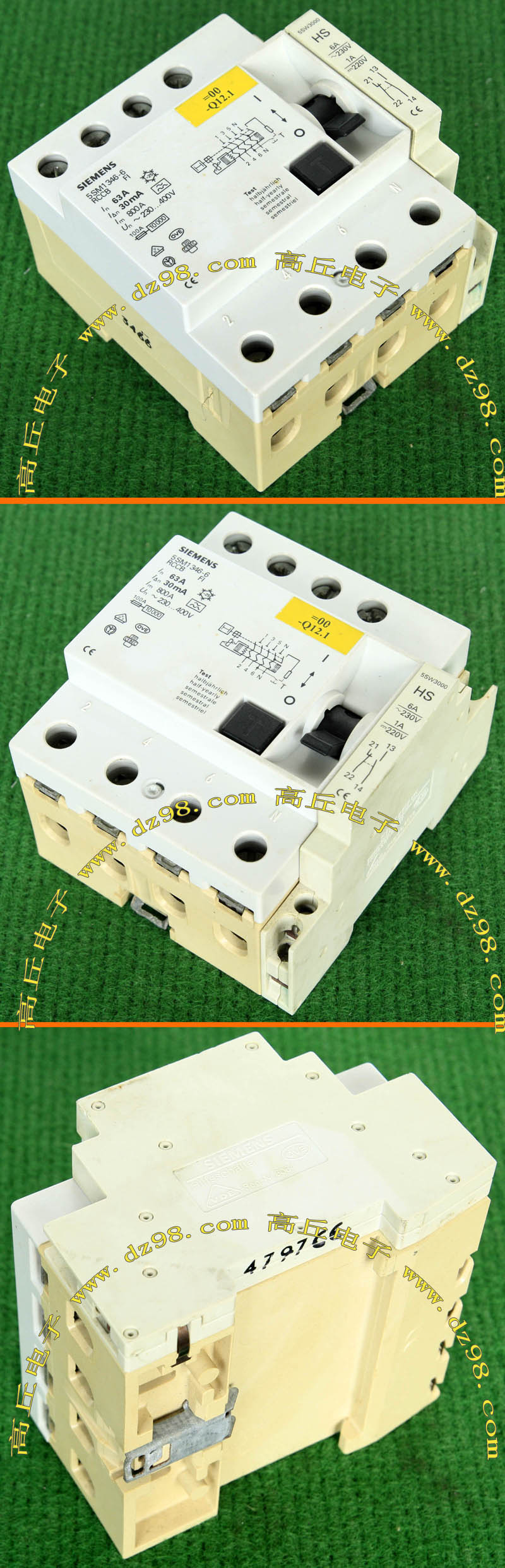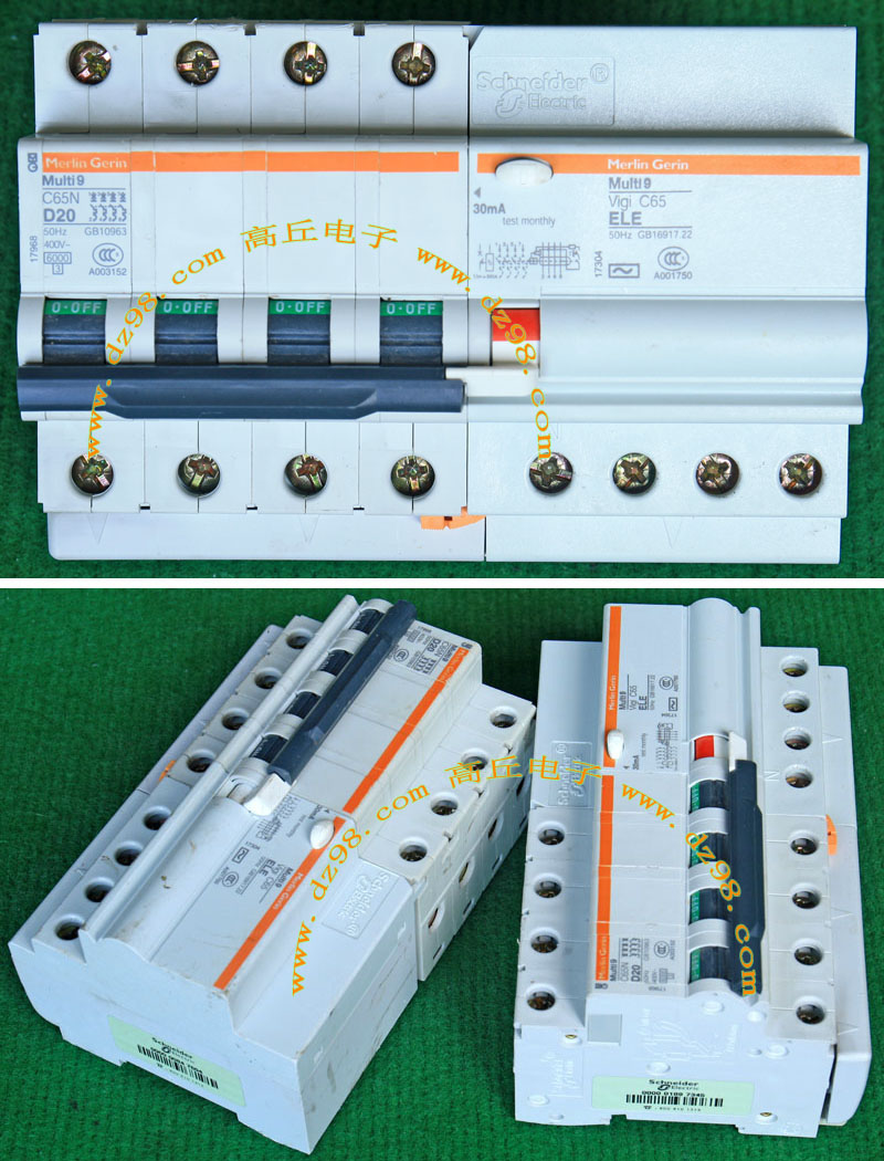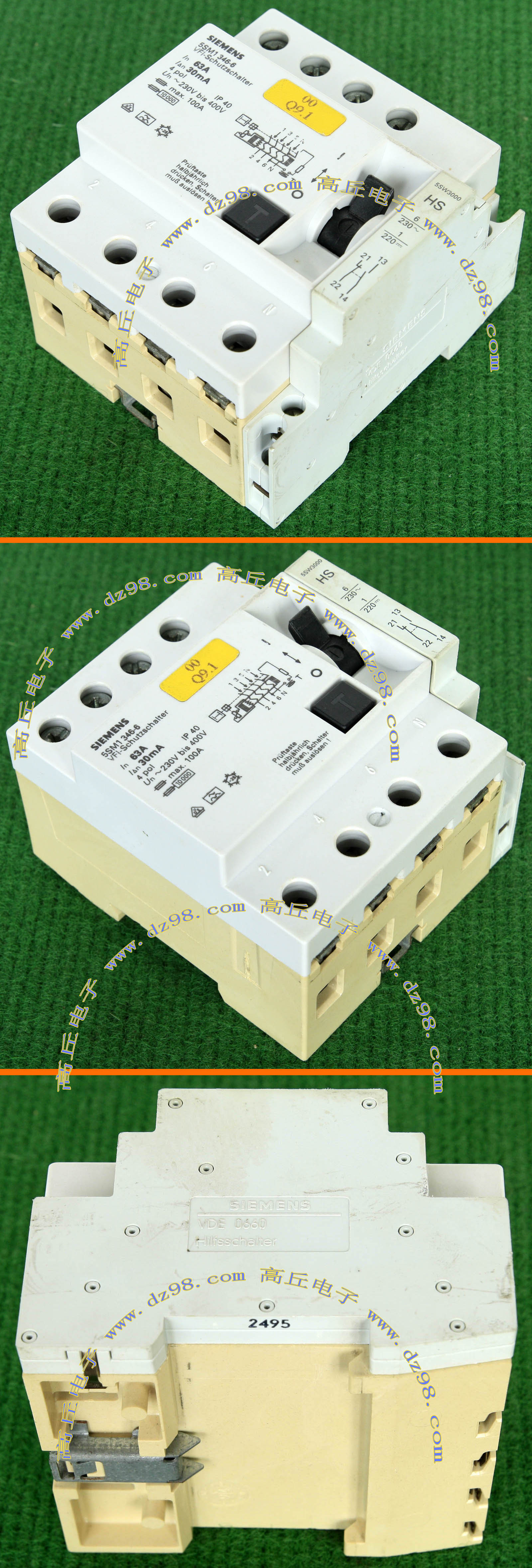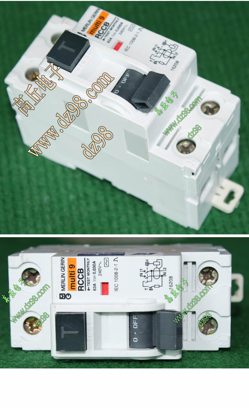 拆机件,外观如图,导轨安装,工作电压AC240/415V,电流63A,漏电感度0.030A,重量约510克。