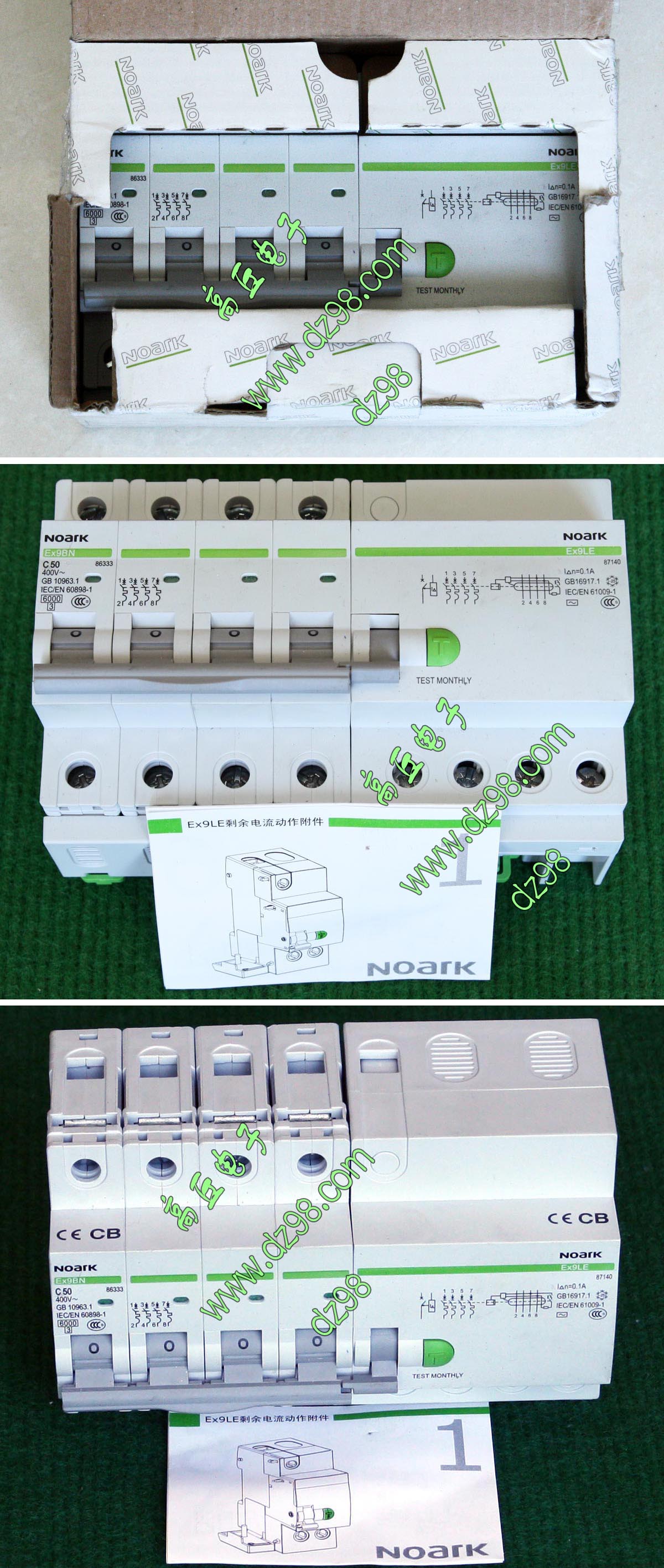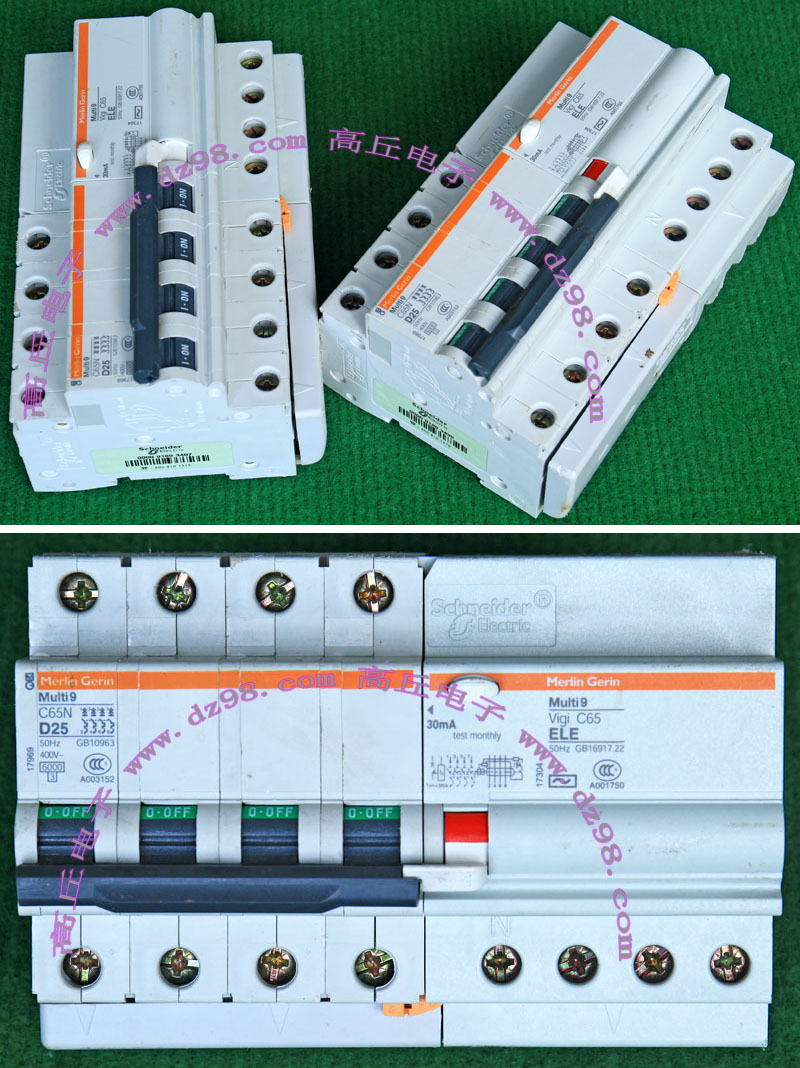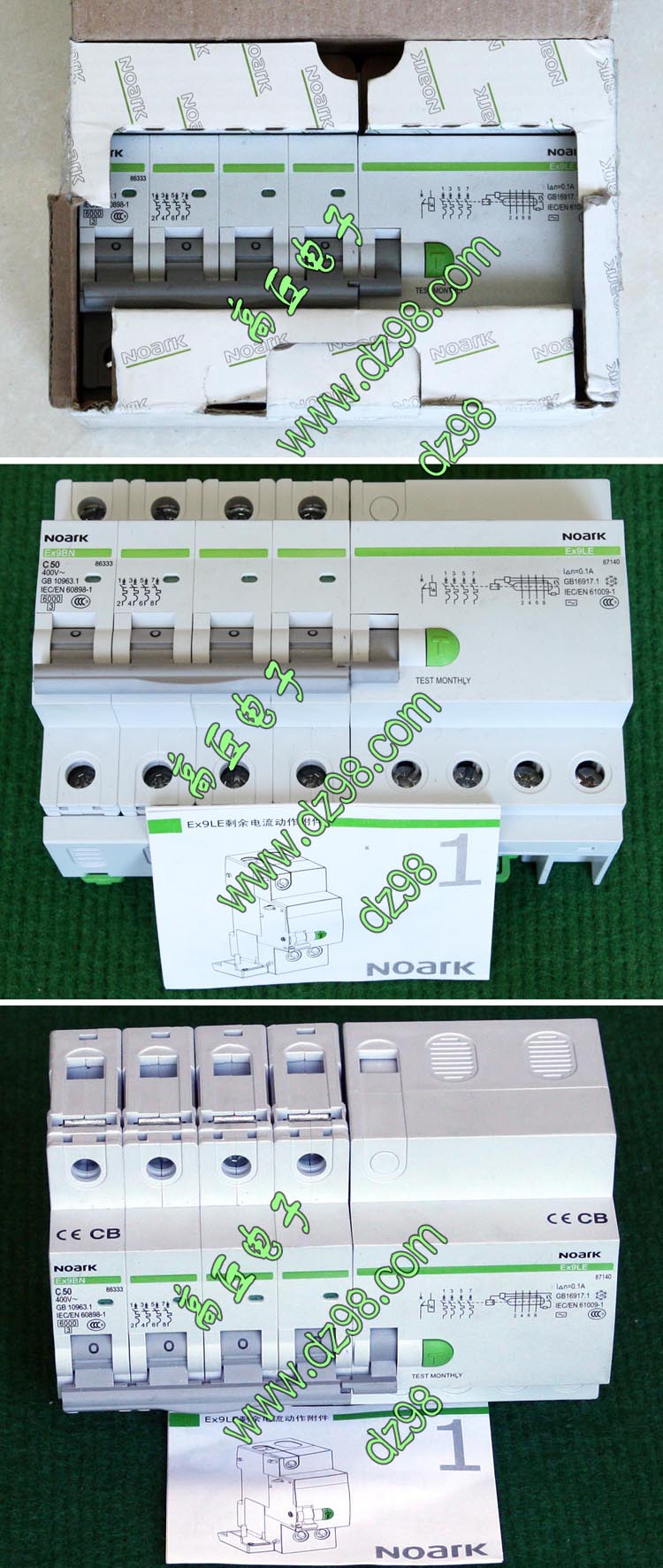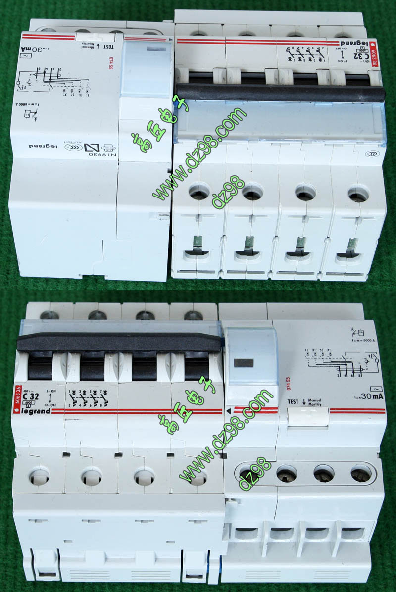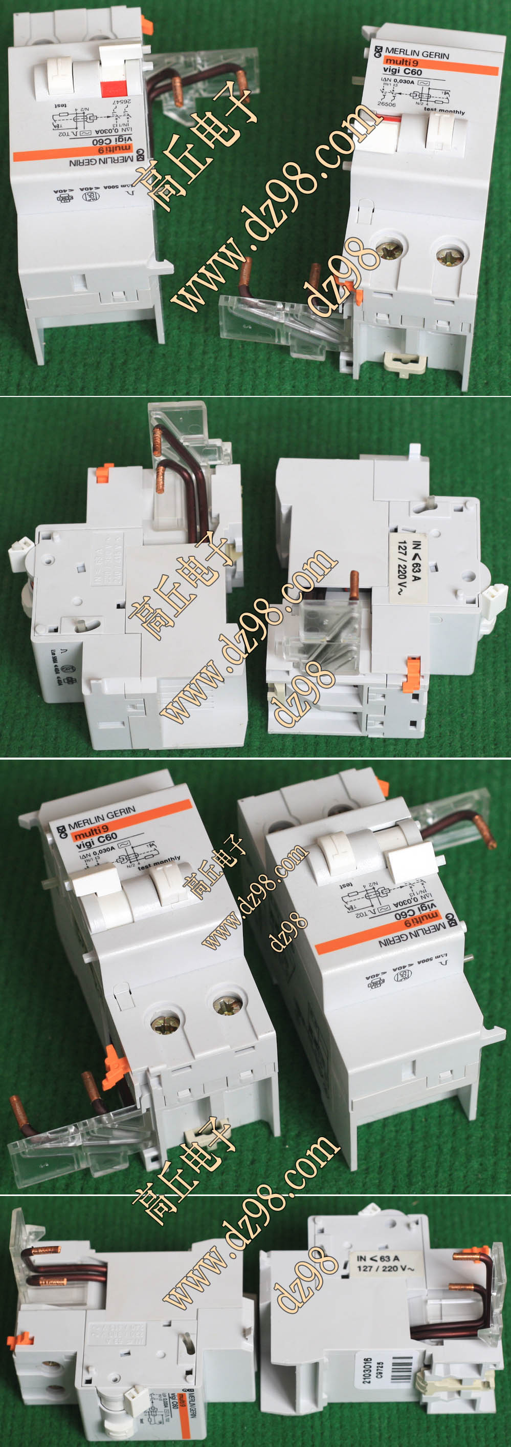 拆机件,外观如图,导轨安装,工作电压AC240/415V,电流63A,漏电感度0.030A,重量约510克。