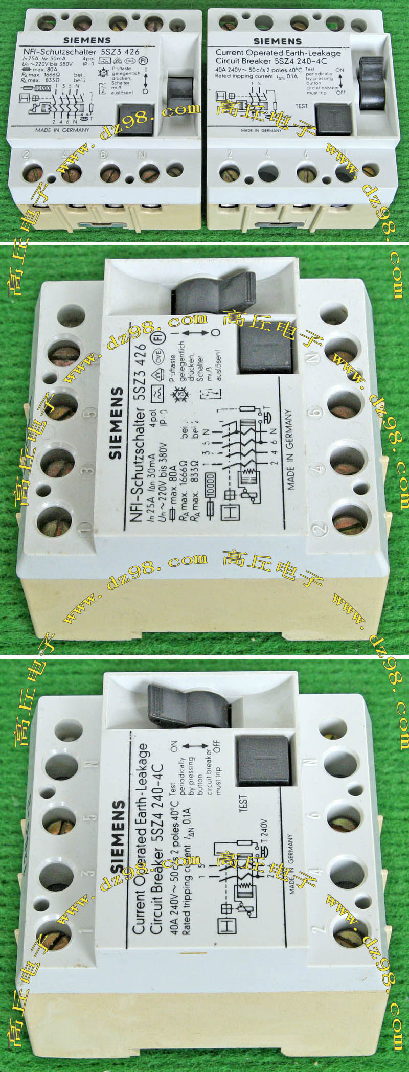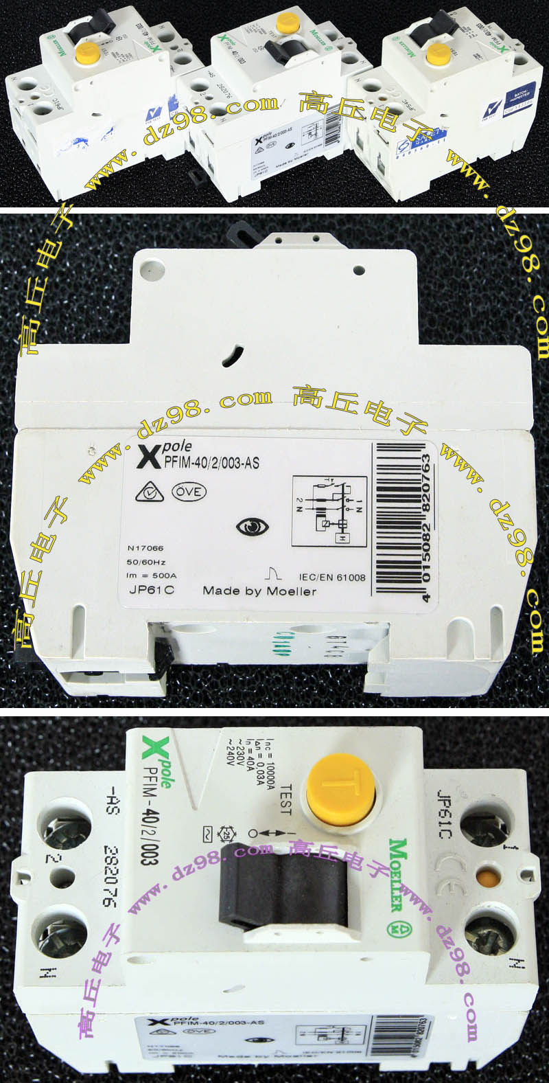 进口拆机,实物看图,230V-400V 40A,漏电动作电流0.03A。重量约324克。