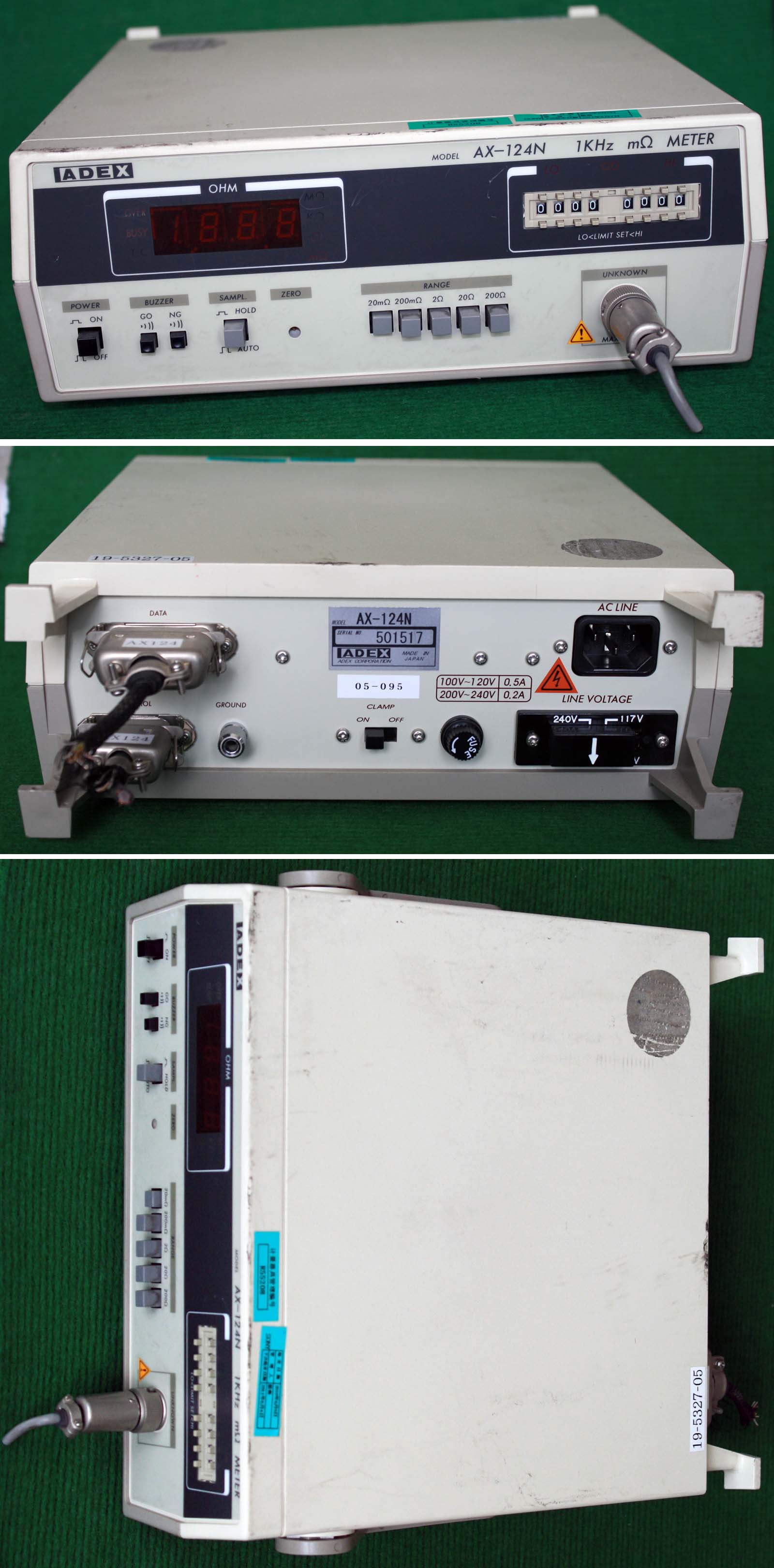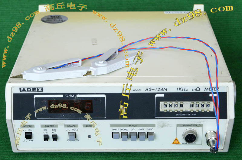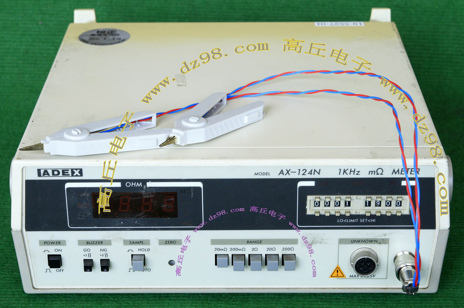 AX-124N 毫欧表 电池内阻测试仪,原配的插头找不到,另外加装了插头和测试夹钳。 电池毫欧测试仪AX-124N ●测试范围:0.00mΩ~199.9Ω ●四端子测试模式 ●配备C-E(连接检查)功能 ●内置比较器判断比较结果,集电极开路输出,带声光报警功能 ●配备RS-232C接口 概 述 电池毫欧测试仪AX-124N为1kHz数字低电阻表,通过 1kHz 交流信号高速测试极低的电阻。内置的数字比较器,将测试值与设定值比较,比较结果前面板LED显示:LO/GO/HI 并带蜂鸣器声音报警,集电极开路输出。 电池毫欧测试仪AX-124N应用于继电器,开关,连接器接触阻抗测试,电池内阻测试等。 由于同步模式的应用,即使有系列感抗存在,该仪器也只进行纯电阻测试。 即使开路测试,峰值电压也低于20mV,所以可以有效防止破坏被测物的表面氧化层。 |
