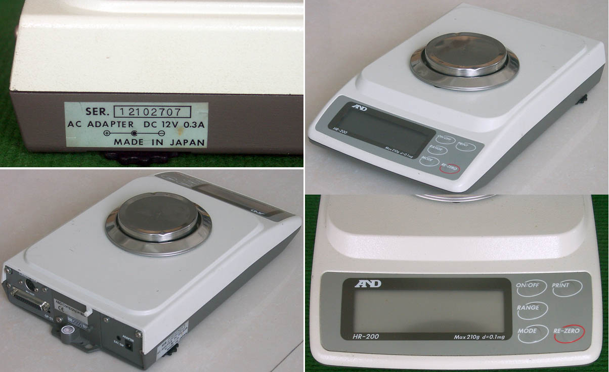 拆机件 | 拆机件,从电子设备拆下,型号HR-200,厂牌AND,产地日本,外观8-9成新,使用电源直流12V,最大称重量210克,分辨率0.1mg。 |