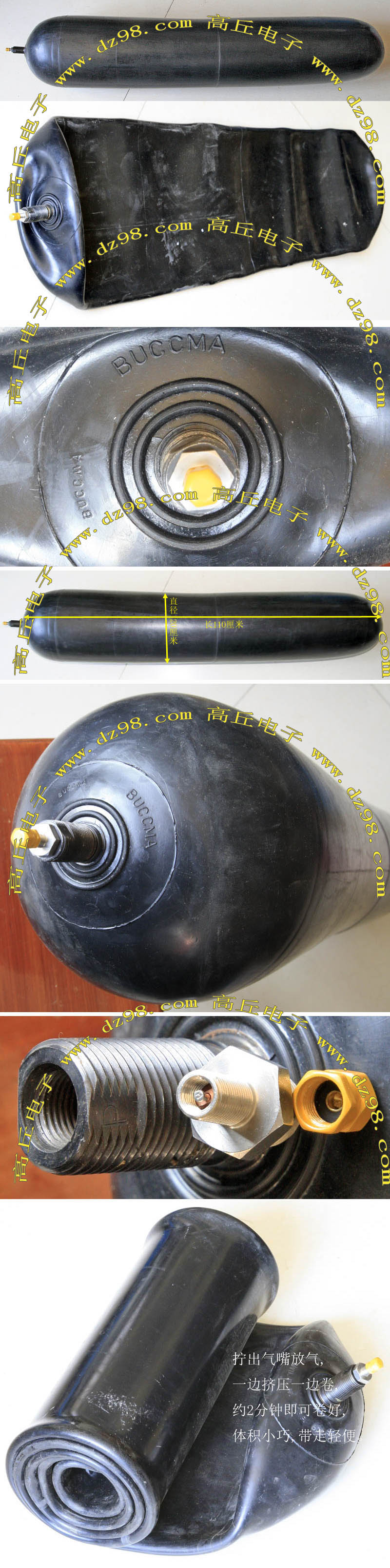 原装备件,带气嘴(和汽车胎一样的气嘴),充气后长度约110厘米,直径约20厘米,容积约30升,放气后卷收重量约2.75公斤。除了当储能器皮囊使用外,还可以挂在小船两边提高稳定性和浮力。 厂家网站http://www.buccmaworld.com |