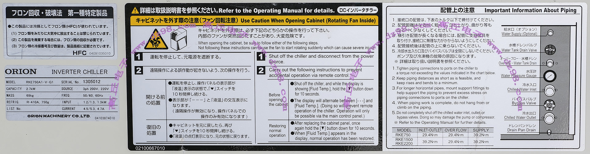 | ORIAN好利旺RKE750A1-V INVERTER CHILLER变频冷水机CH164 | 二手,激光焊机冷却配套机。也用于电子设备水冷却循环散热机。外形尺寸;40x69x高83厘米。 |