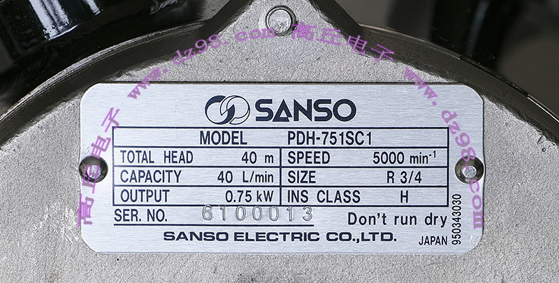 | SANSO PDH-E751FD1 0.75KW 三相200V 冷却水循环水泵CH167 | 进口拆机,实物看图,使用电压三相200V,功率750W。扬程40米,流量每分钟40升,转速5000转,重量约11公斤。 |