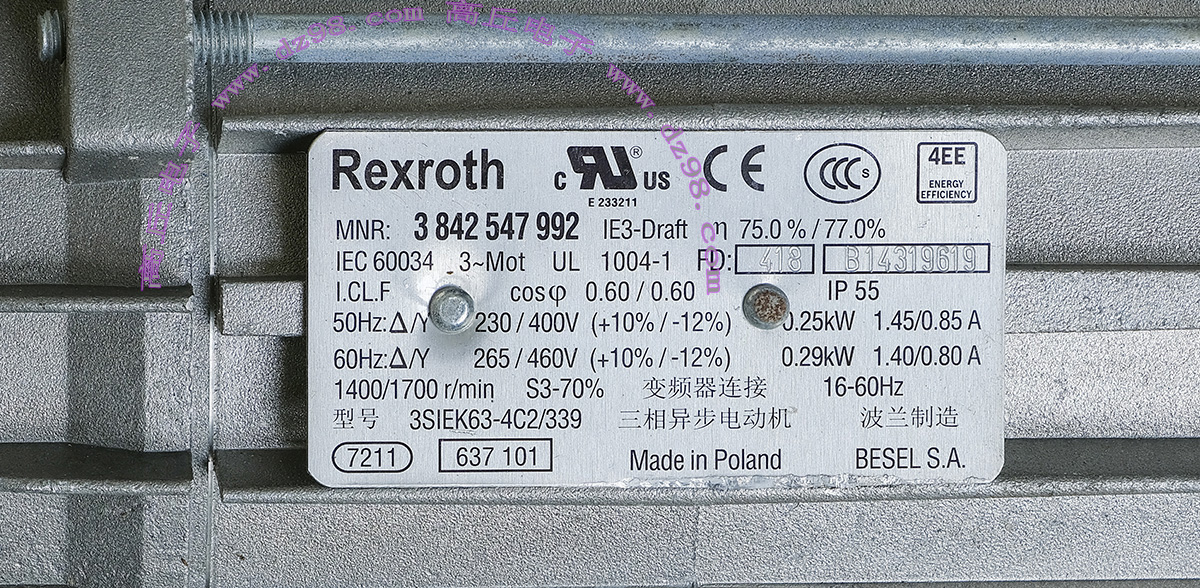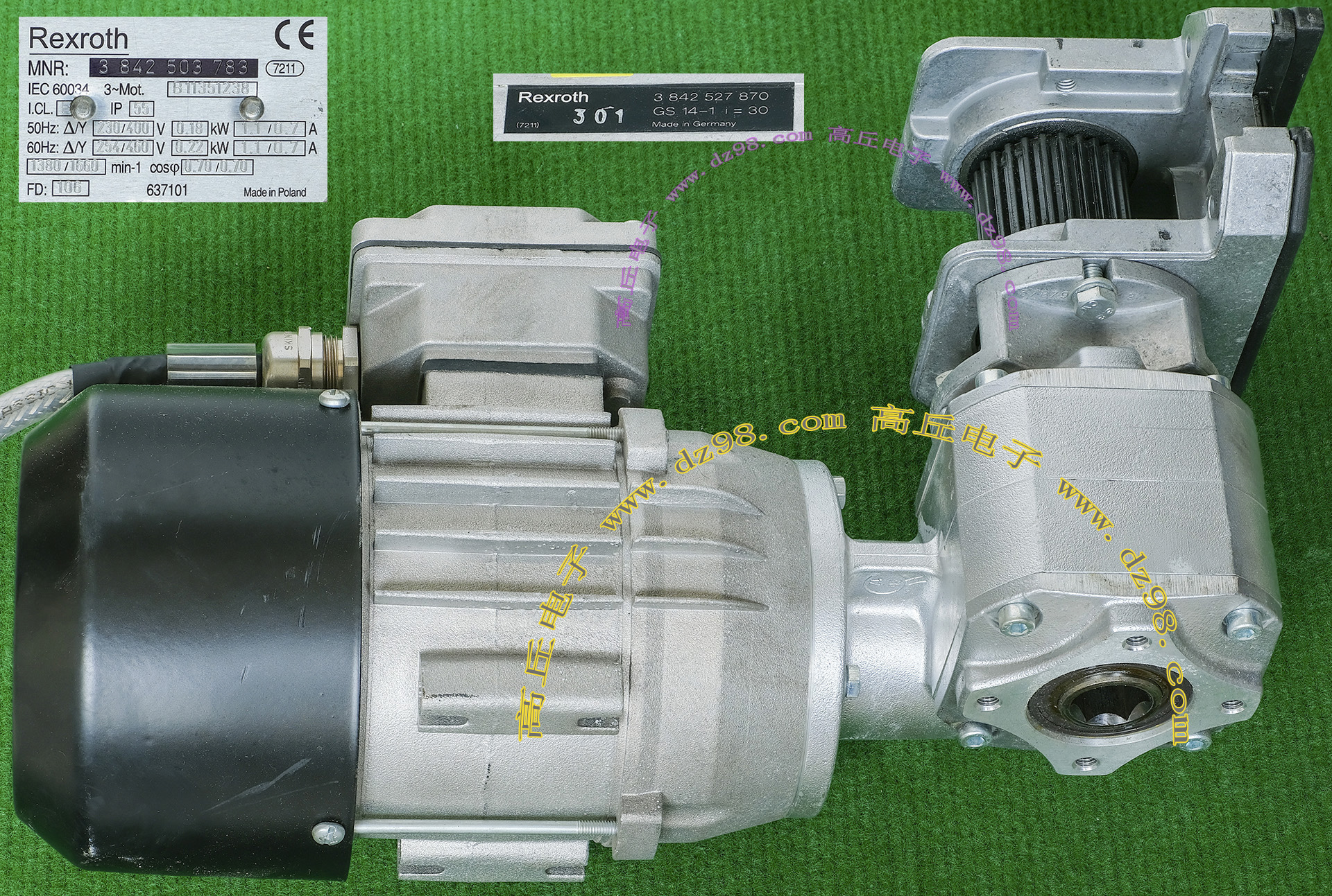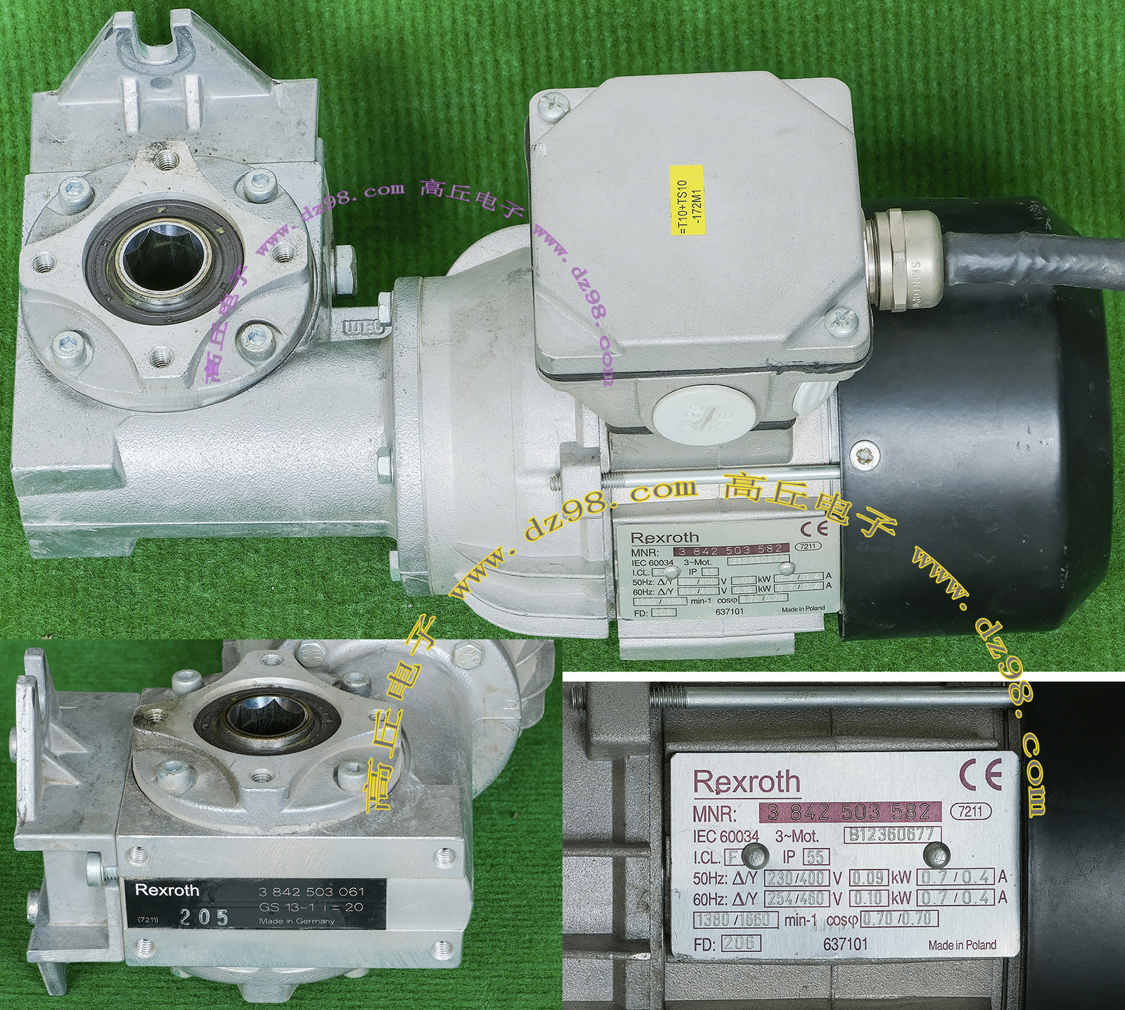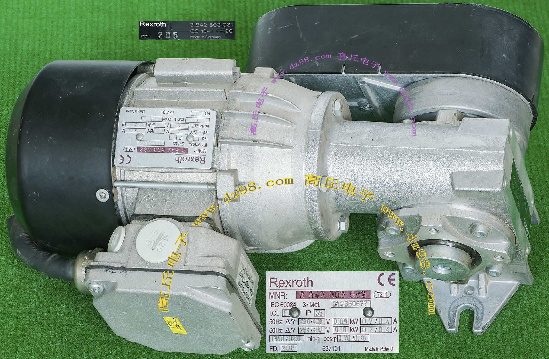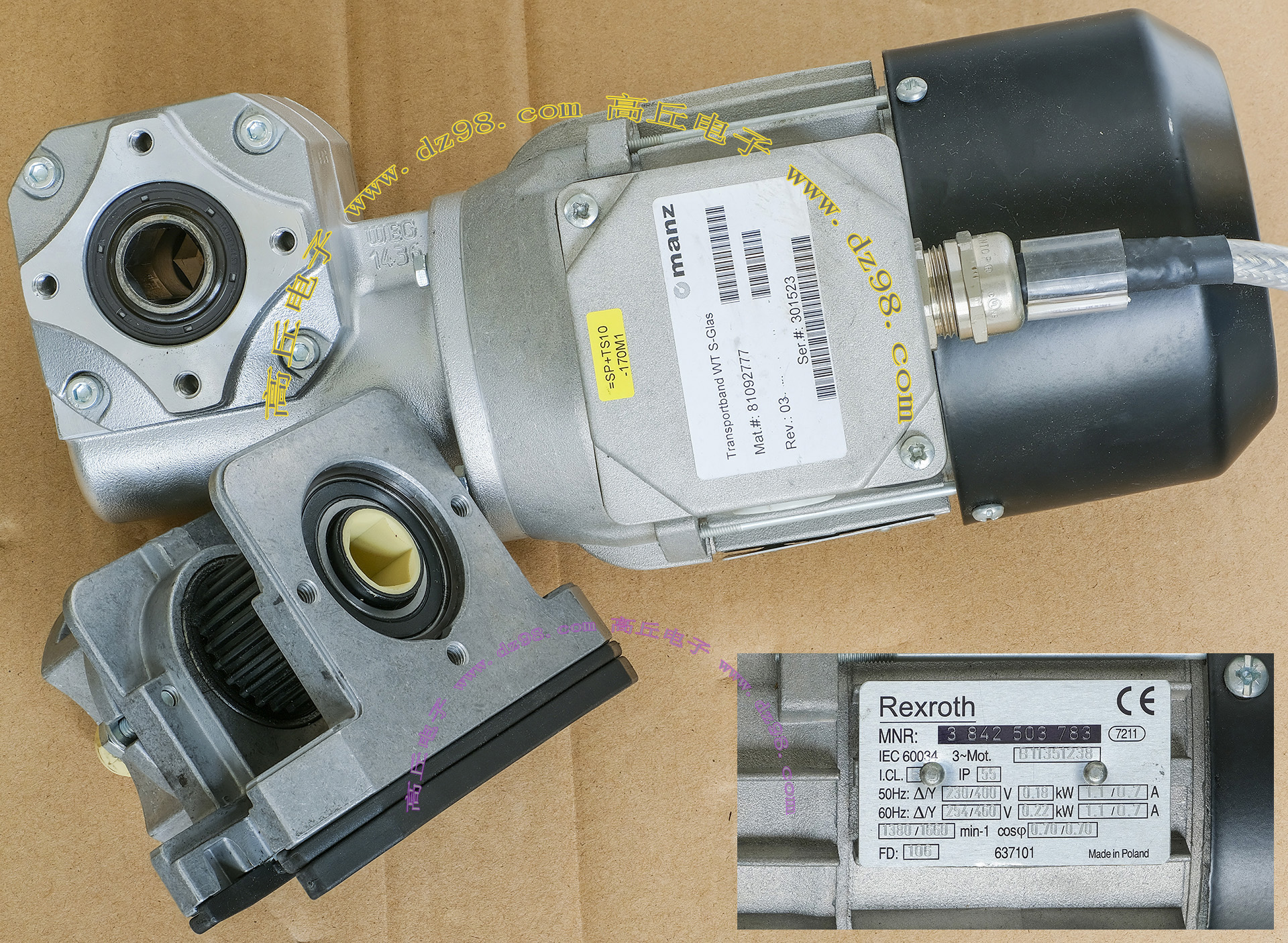 | Rexroth 0.25-0.29KW 涡轮减速电机CH196 | 进口拆机,实物参照图片,厂牌;Rexroth、电机产地;Poland,减速箱产地;germany,重量约10.05公斤。电机数据;三相50Hz、230V/400V、0.25KW、三相60Hz、265V/460V、0.29KW。 |