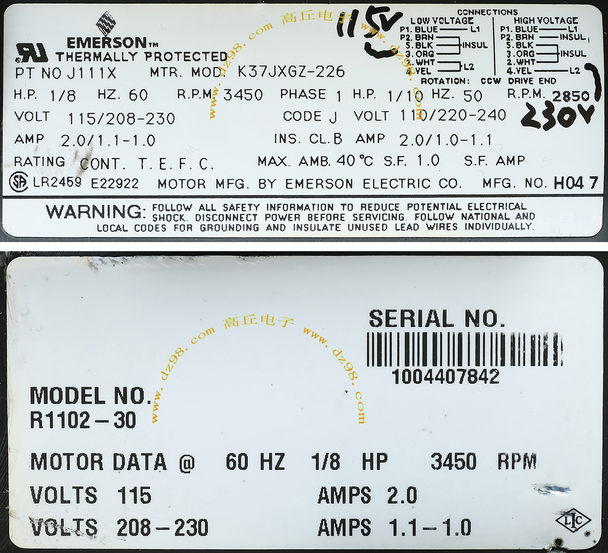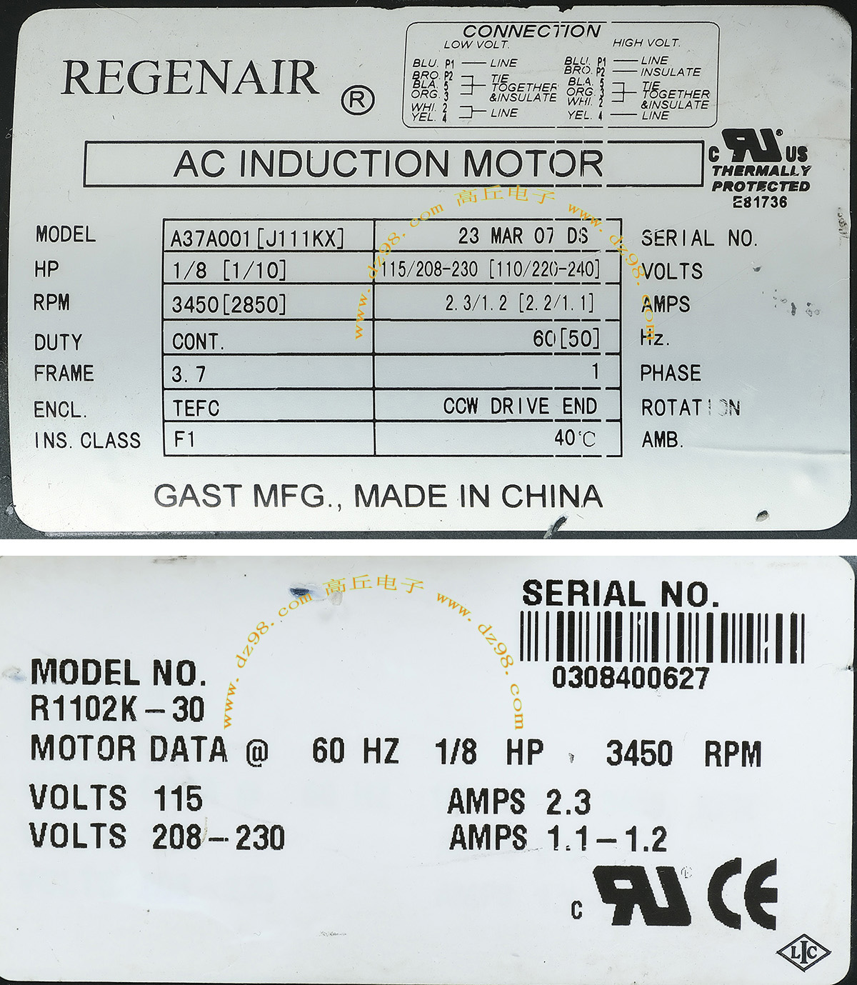 | A37A001 K37JXGZ-226 R1102K-30 R1102-30单相208-230V强力风泵CH203 | 进口拆机,实物看图片,使用电压;单相208-230V,电流1.1A。 |