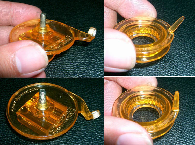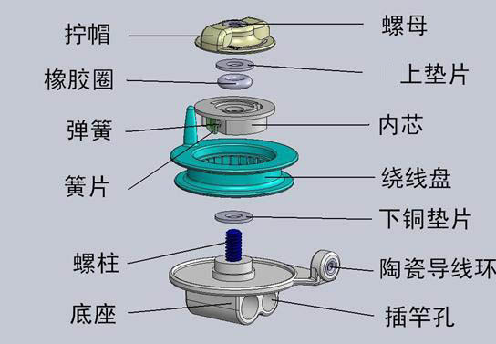 为了防止出线时,内部结构带动拧帽一起旋转而自动锁紧并可能锁死泄力,拧帽中间的孔,螺纹是不做穿的,在我们锁紧泄力时,起到一个紧固和限制的作用,而因其材料有一定的可塑性,我们可通过强制锁紧拧帽而获得所需要的泄力值,方法就是,当我们用手锁紧泄力,而泄力仍太松时,可借助工具(钢丝钳/尖嘴钳)来旋紧拧帽,然后在出线方向旋转绕线盘感觉一下泄力,过小则继续调紧,觉得泄力合适了,再继续来回调整拧帽,直到我们单凭手的力量便可调出合适的泄力为止。