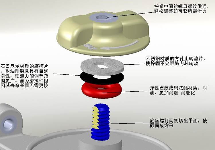 看图上结构分析,泄力是通过拧帽在螺柱上出入,压住橡胶圈以后产生预压力,预压力作用在相对运动的零件上产生磨擦力,此磨擦力就是我们所需要的泄力。