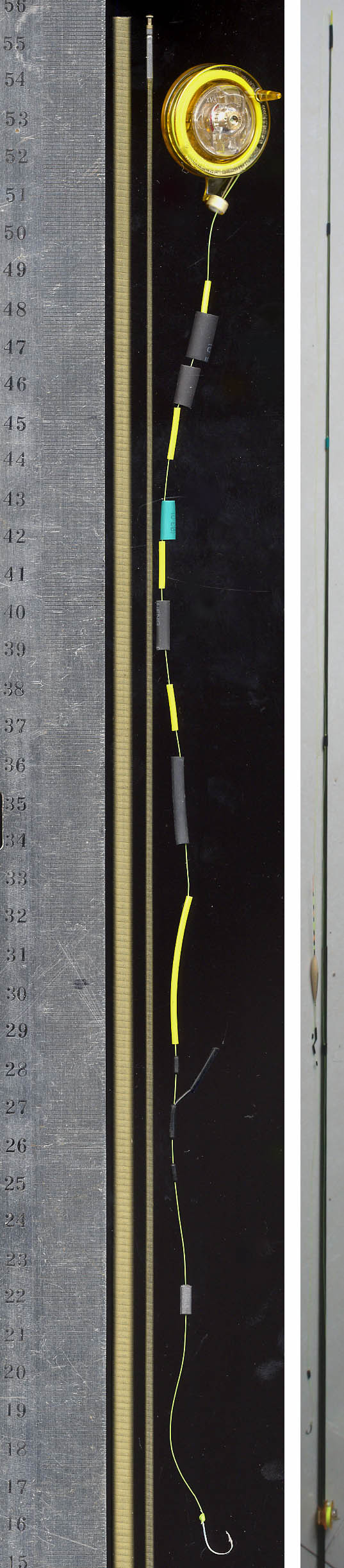 浅水区(1米内)尽量用小标轻铅垂,使灵敏度更高,如果是用单钩钓法,下面的铅皮可以直接包在线上,这样体积更小,不使鱼警觉钩子可以直接绑在主线上,也可以加个小的8字环,下面的子线用比主线小点的,这样挂底只丢一钩。