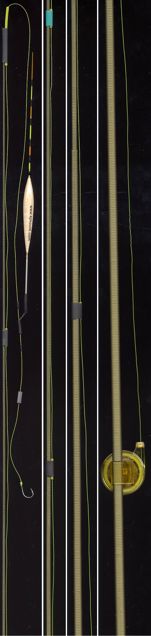 到钓场组装钓组,拉出竿子前几节,轮子上竿卡住,热缩管配合塑料王管一节一节套好,最后套竿稍是塑料王管申出竿尖2-3厘米,使之不易缠线,类似中通竿的出线,根据钓场水深拉出合适长度鱼线,调标后记住把泄力调到比线组承受力稍小点就可以钓鱼了。