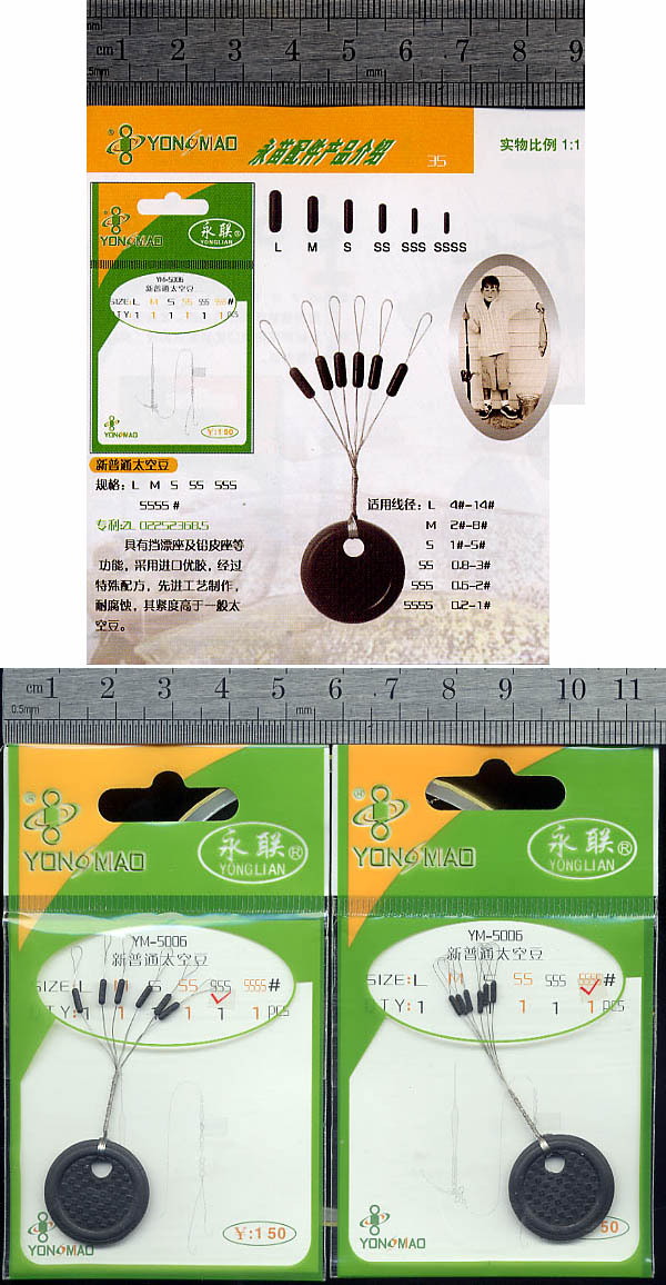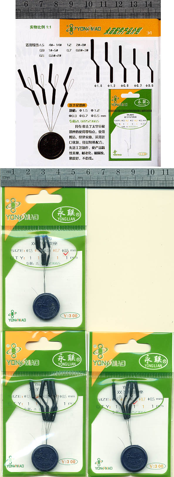 | 永联双子星漂座0.9mm号YGB003 | 本品符合浮漂脚使用直径1mm-1.5mm之间。 太空豆与浮标座一体化结构,最完善的结合,根据浮漂在水里运作科学概念而生产,免除常规漂座灵敏差和易缠线结局。每只尺寸:长度约26mm,太空豆处直径1.8mm。钢丝直径0.10mm。 |