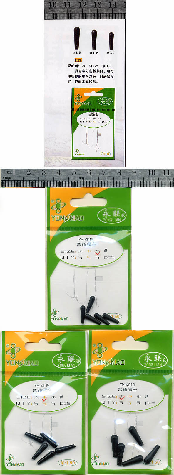 | 永联普通漂座中号YGB008 | 本品符合浮漂脚使用直径1.8mm以上。最经济实惠的浮漂座。每只尺寸:长度约15mm,大头处直径4.3mm,小头处直径2.6mm。 | 每包重量约2.3克,内装数量5只。 | 单价1.2元,10包起售1.05元,要更多请先联系。 |